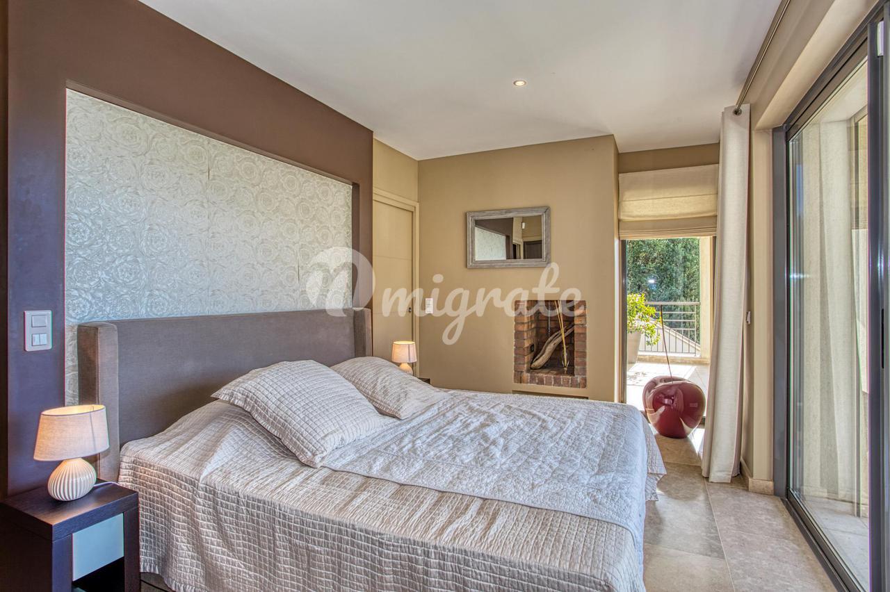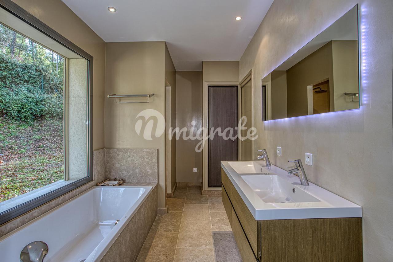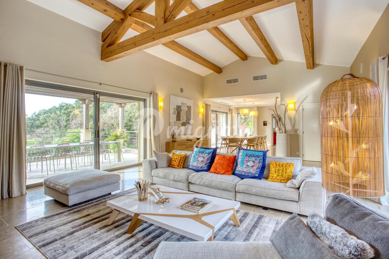 Большая гостиная открытой планировки, которая выходит на просторную террасу, столовая, которая также выходит на террасу, кухня в современном стиле и пять спален с собственной ванной комнатой или душевой. Вилла расположена на территории площадью около 2 гектаров, которая включает газоны и лесные массивы, а также великолепный бассейн, встроенный в скалу.