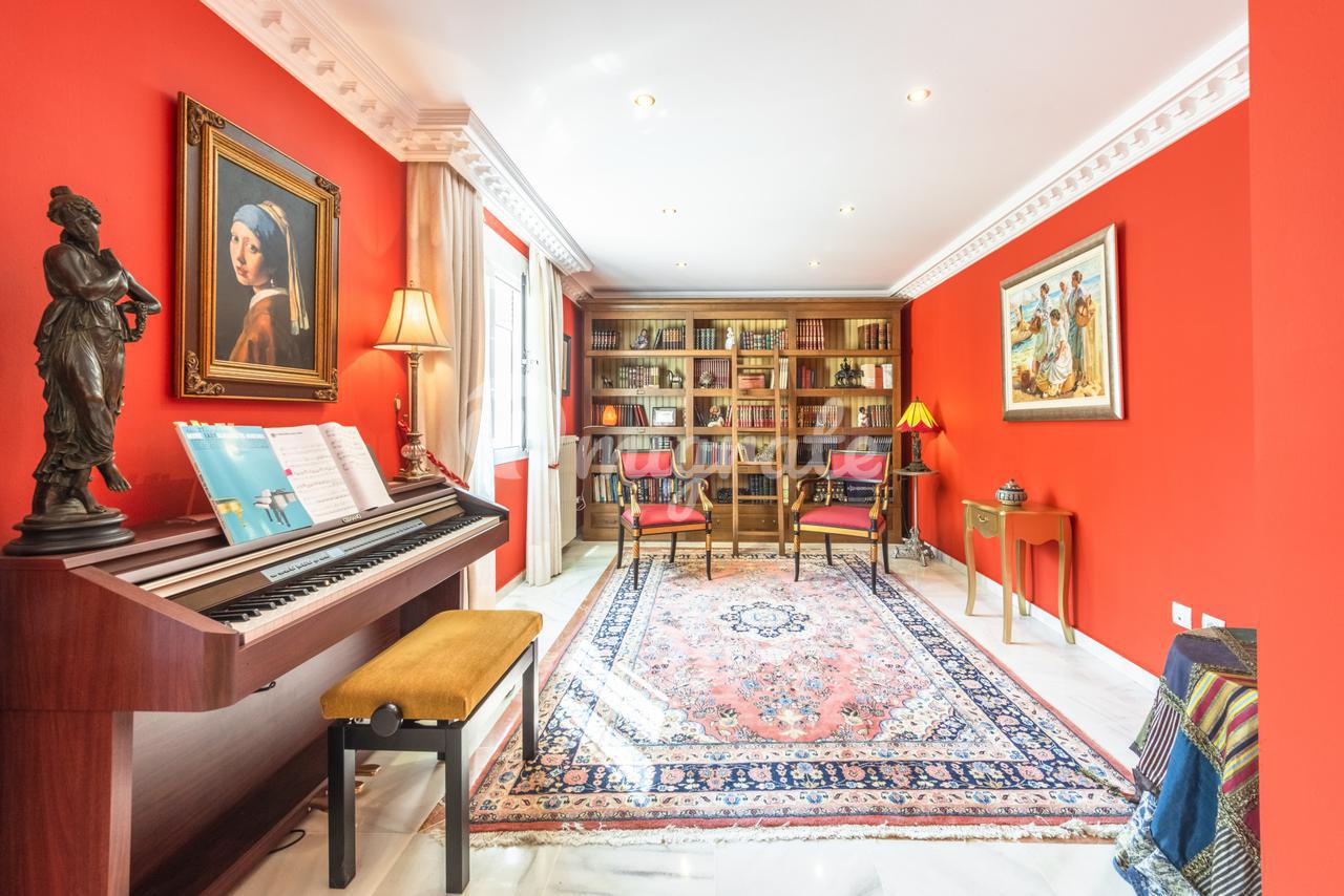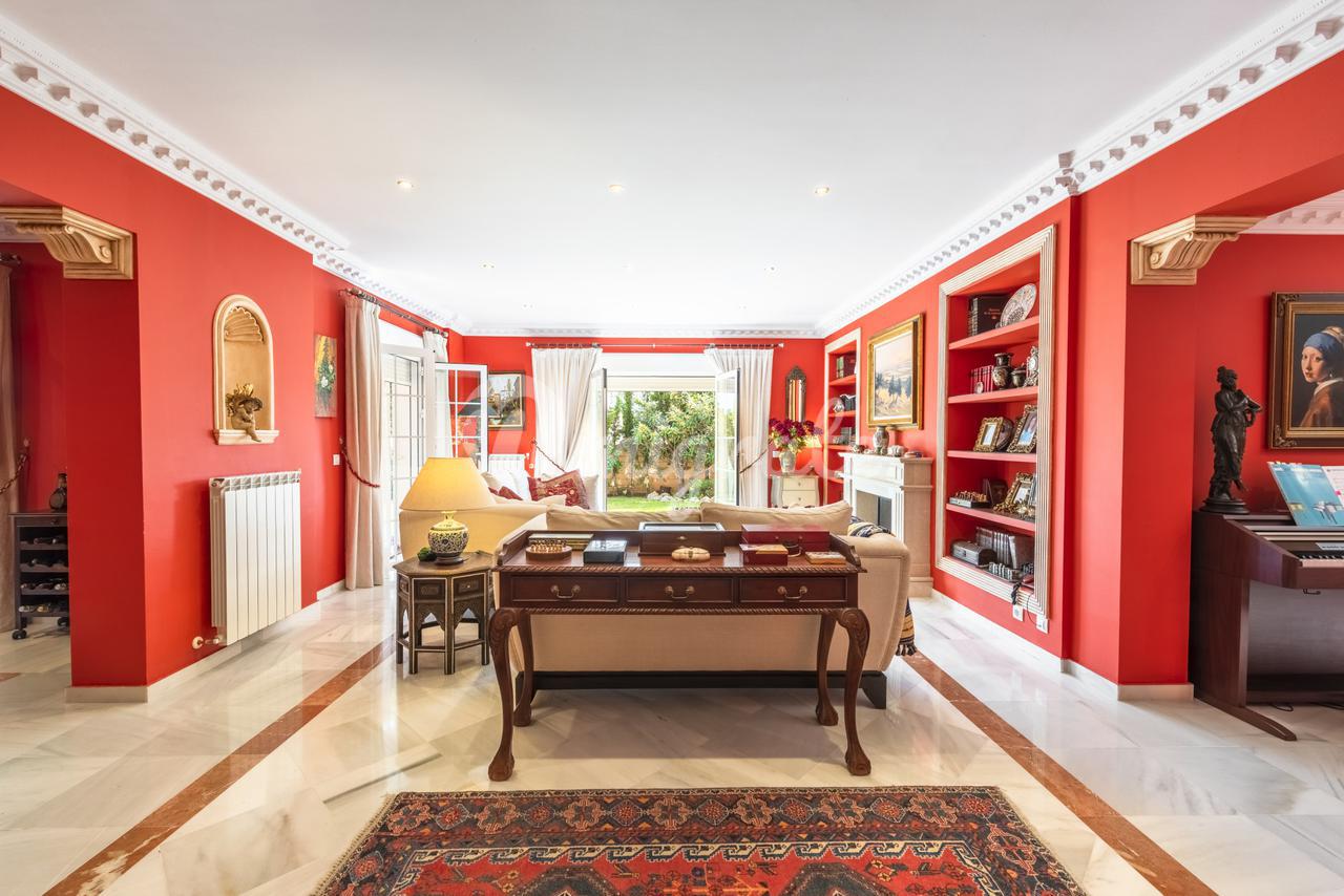 На первом этаже очень высокие потолки, двойная гостиная с камином и выходом на веранду, отдельная столовая, дополнительная гостиная с выходом в сад, большая полностью оборудованная кухня с зоной для завтрака, одна спальня с ванной комнатой и гостевая туалет.