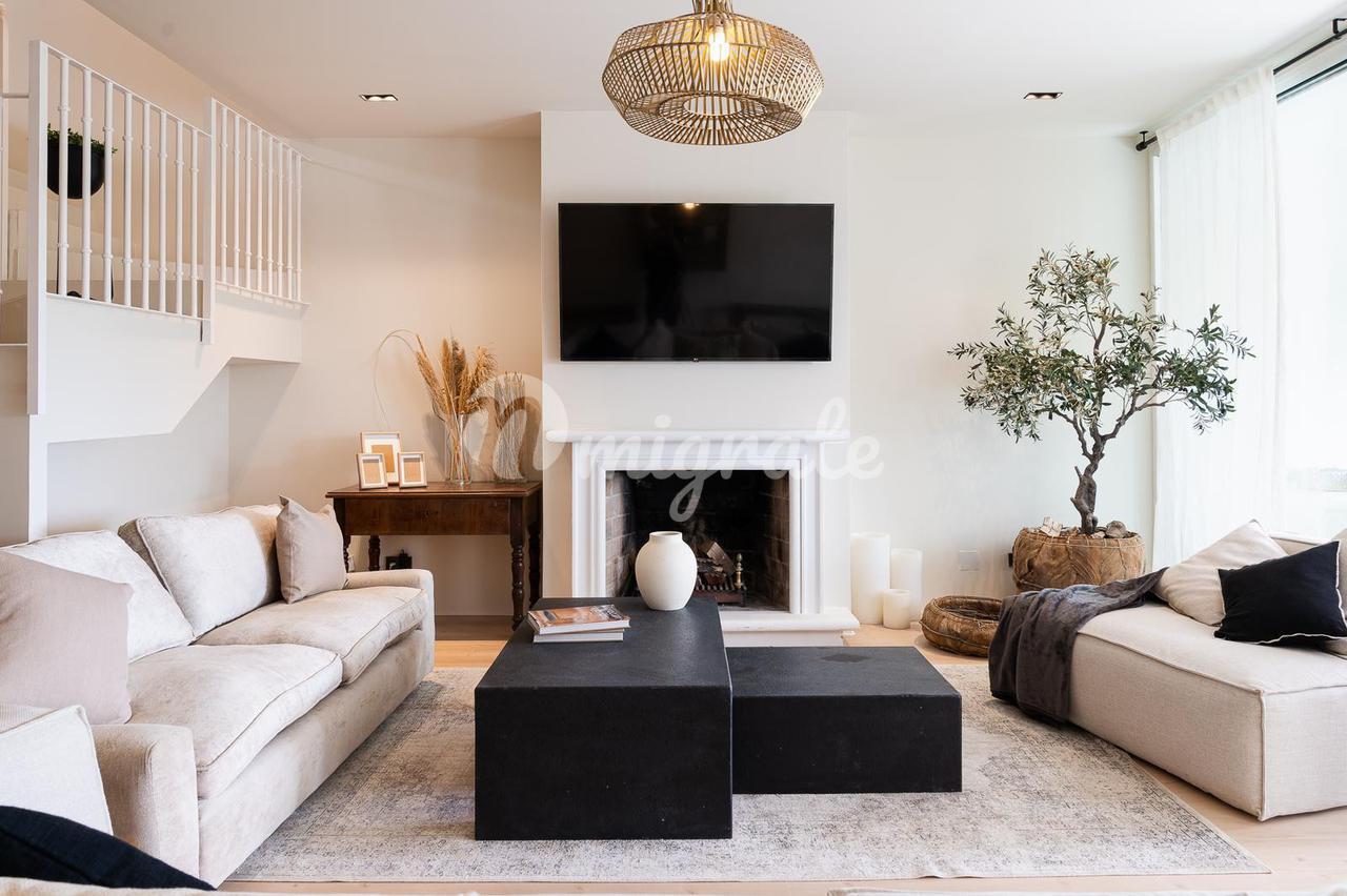 На первом этаже находится прихожая с гардеробной, шкафами-купе, большая кухня открытой планировки с зоной для завтрака, гостиная / столовая с камином и дверями в частный сад.