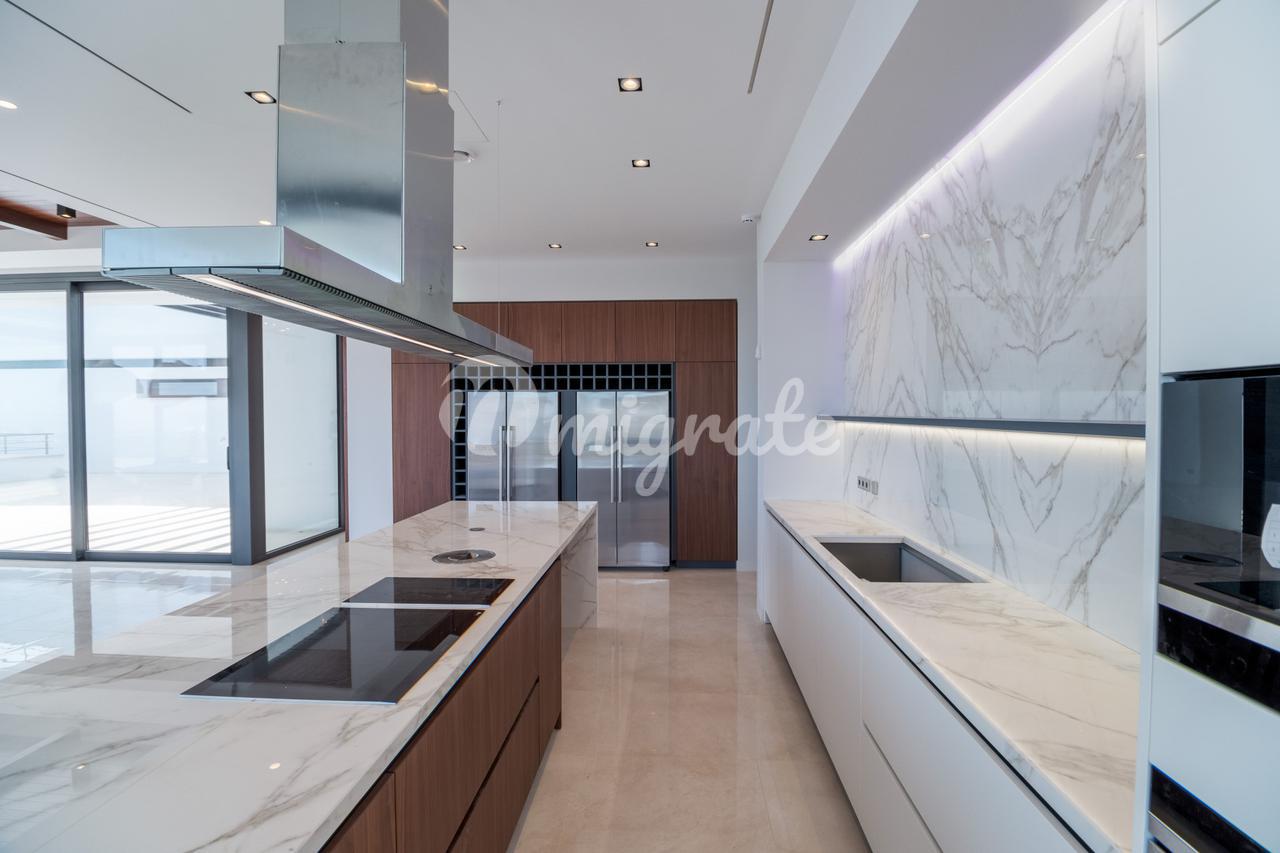 Он имеет 12 просторных спален с ванными комнатами и почти каждая комната имеет собственную террасу. Полностью оборудованная кухня с обеденной зоной и открытым видом. Кинозал, танцпол и бар с профессиональным винным погребом. Спортзал с сауной. Квартира для персонала и гараж на 6 автомобилей.