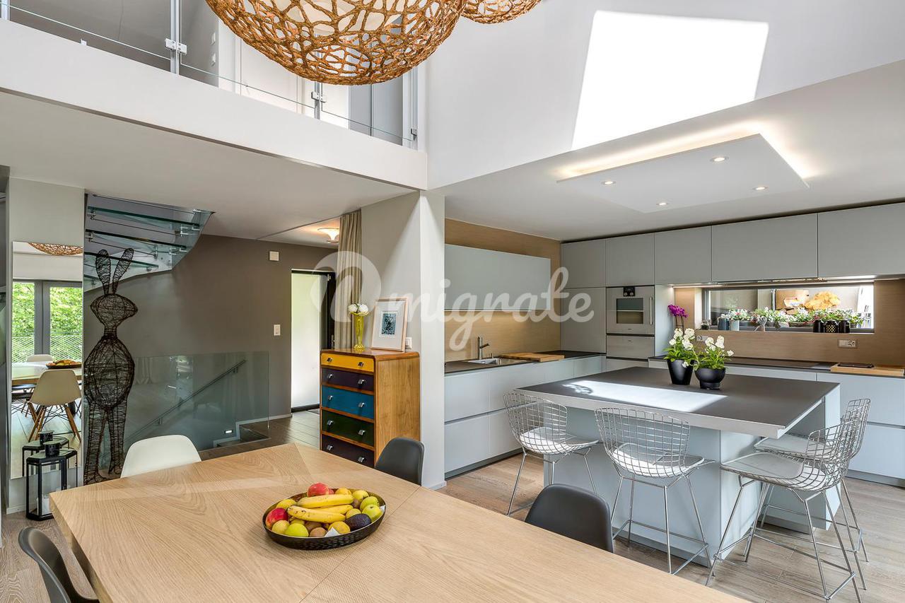 Дом включает в себя на верхнем первом этаже прихожую, гостиную с камином и выходом на большой балкон, полностью оборудованную кухню с центральным островом и гостевой туалет. На первом этаже находится антресоль/кабинет, две спальни, каждая с собственными душевыми и гардеробными, На цокольном этаже есть еще две спальни, общая душевая, большая площадка с возможностью создать кабинет, складские помещения, прачечная, подвал, мастерская и выход на террасу.