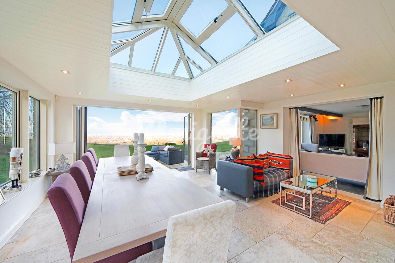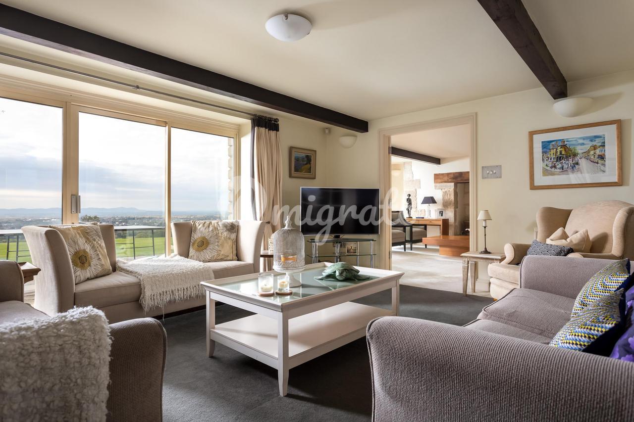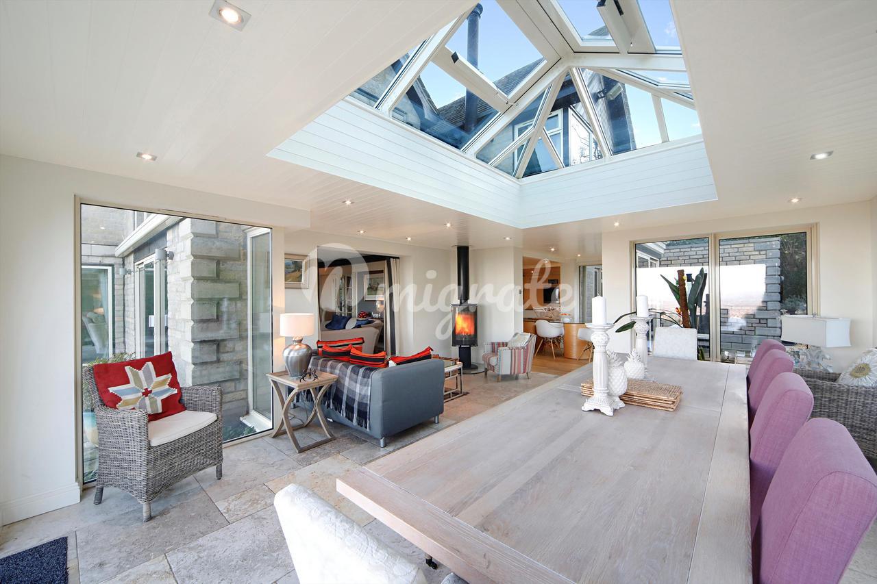 Доступ к дому осуществляется через автоматические ворота, ведущие к большому широкому подъезду, который обеспечивает просторную парковку и доступ к гаражу на две машины. Внутренний вестибюль двойной высоты обеспечивает подходящий вход в этот восхитительный дом и открывается в основные приемные и жилые помещения. На уровне первого этажа жилье имеет воздушное и «открытое» ощущение. Есть благоустроенная кухня с подсобным/загрузочным помещением позади; кухня выходит в большую оранжерею, которая идеально расположена, чтобы полюбоваться вышеупомянутыми видами, имеет современную дровяную печь и двери в сад.