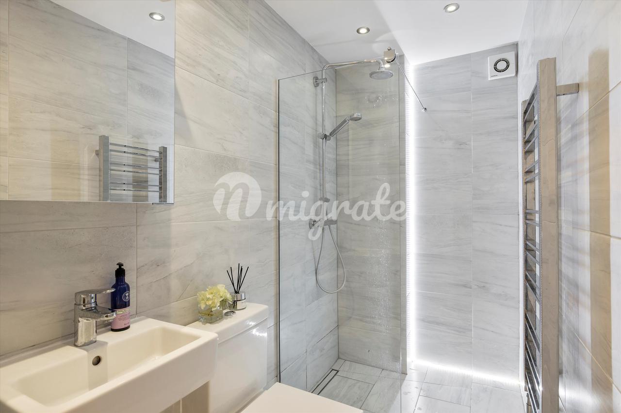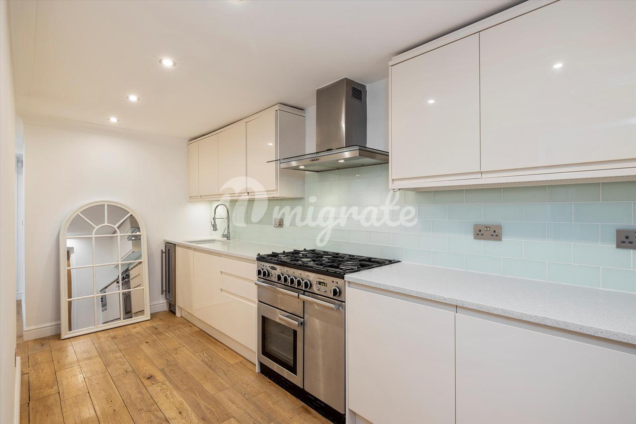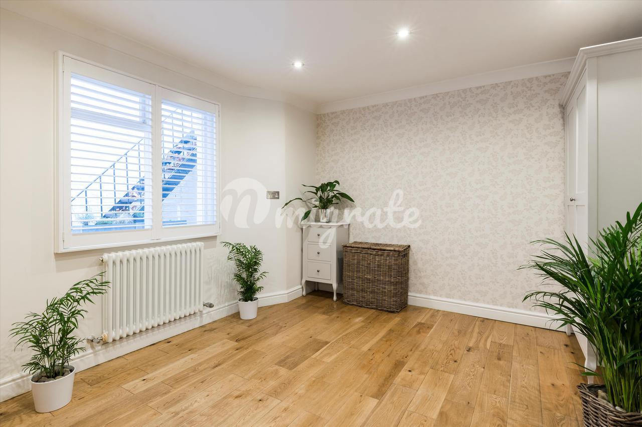 Квартира расположена на цокольном этаже и представляет собой большое пространство для развлечений с деревянным полом и современным электрическим камином. Кухня отдельная и предлагает полностью интегрированный блок.