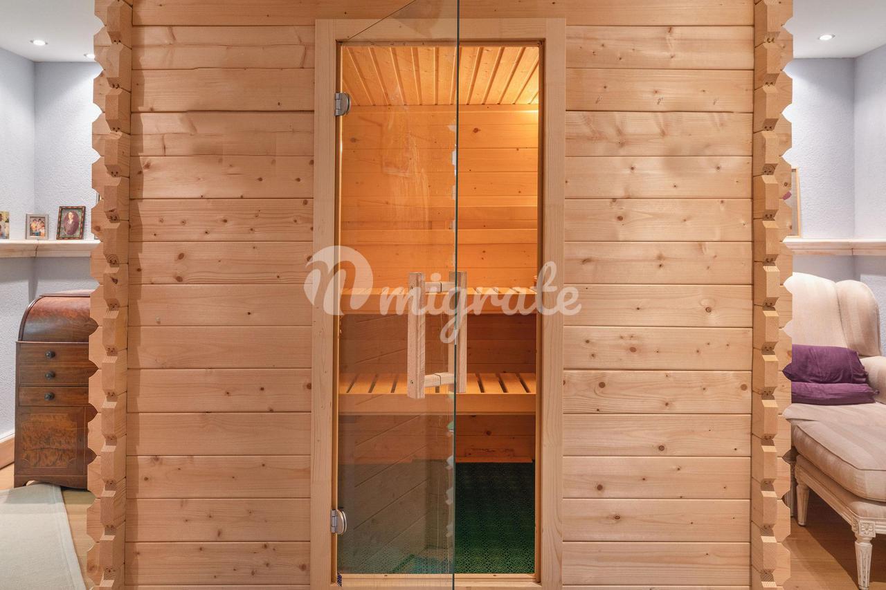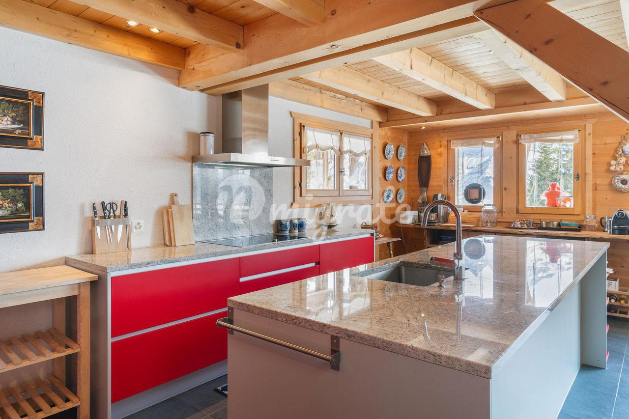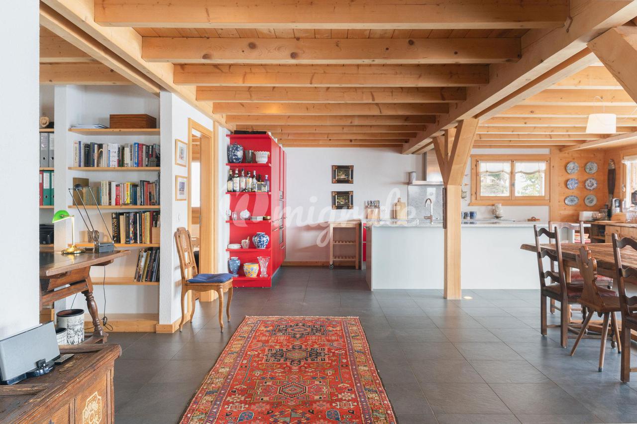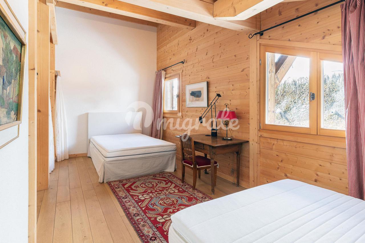 Шале включает в себя на первом этаже прихожую с большой гардеробной и помещением для хранения лыж, гараж на две машины и в конце коридора большую спальню с собственной ванной комнатой и сауной. Просторная приемная открытой планировки на втором этаже предлагает гостиную с офисным уголком, обеденную зону и кухню, все с раздвижными окнами во всю стену и прямым выходом на большую террасу. Существует также дополнительная комната, которую можно использовать как кабинет или дополнительную спальню.