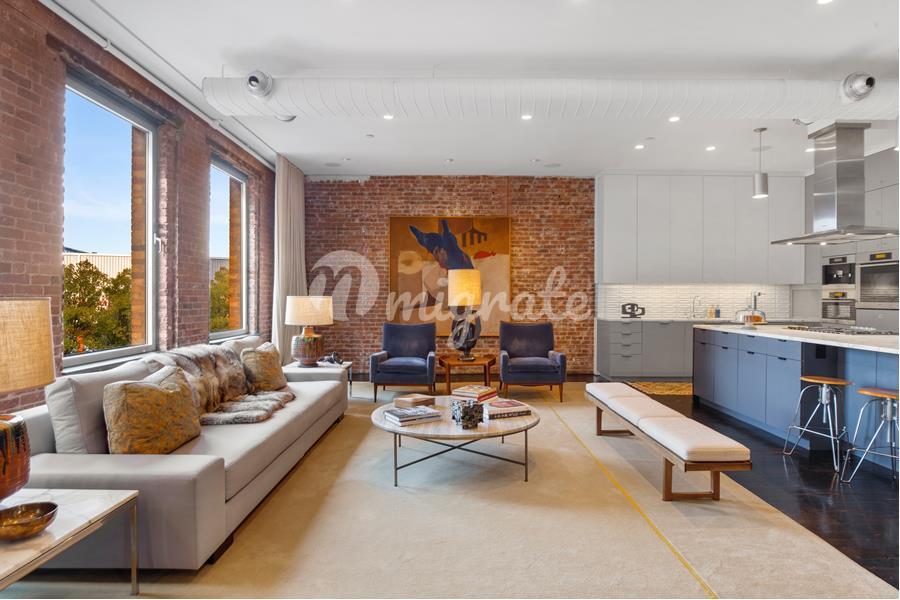 Лифт открывается прямо в дом, и сразу же вас встречает прекрасный южный свет, струящийся через 5 окон, выходящих на юг, и теплые открытые кирпичные стены. Вы входите в большую гостиную/столовую с красивой открытой кухней перед вами. Изысканная кухня шеф-повара может похвастаться газовой плитой Gaggeneau и тремя духовками, холодильником Sub-Zero, двумя посудомоечными машинами Miele и встроенной кофеваркой Miele. Мраморные столешницы, фартук из плитки Heath, изготовленные на заказ шкафы и отдельный бар с раковиной делают это замечательное пространство открытым и привлекательным.
