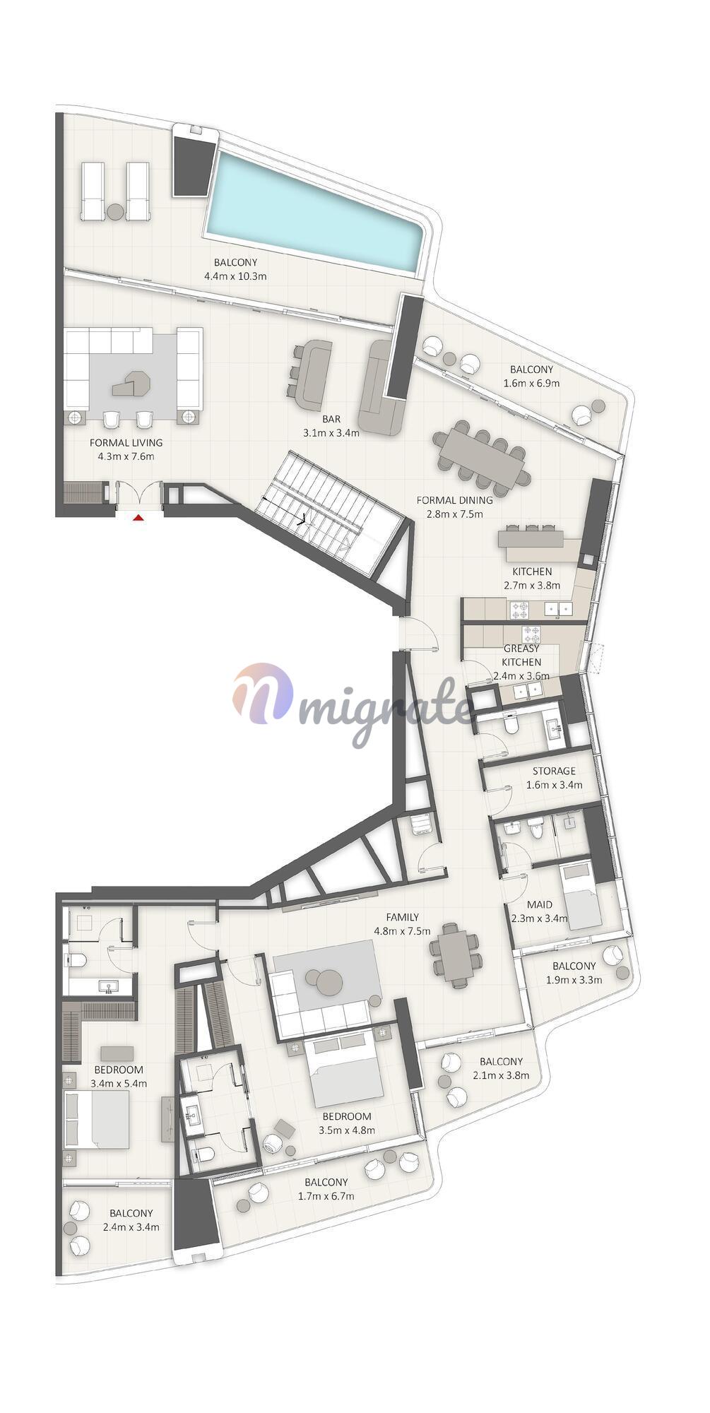 Пентхаус будет полностью укомплектован премиальной европейской кухонной техникой и сантехникой, а с просторной террасы жильцы смогут насладиться видом на Персидский залив и знаменитый остров Palm Jumeirah.