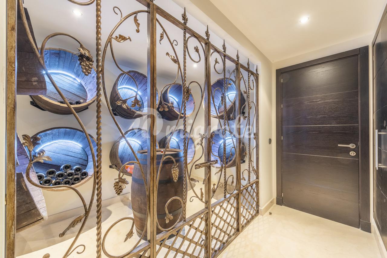Цокольный этаж состоит из спальни, спортзала/игровой комнаты, сауны, винного погреба с деревянными бочками и прачечной с бытовой техникой Miele. Планировка цокольного этажа позволяет соединить различные части, различая функции, а также предлагает доступ к нижнему саду с фруктовыми деревьями.