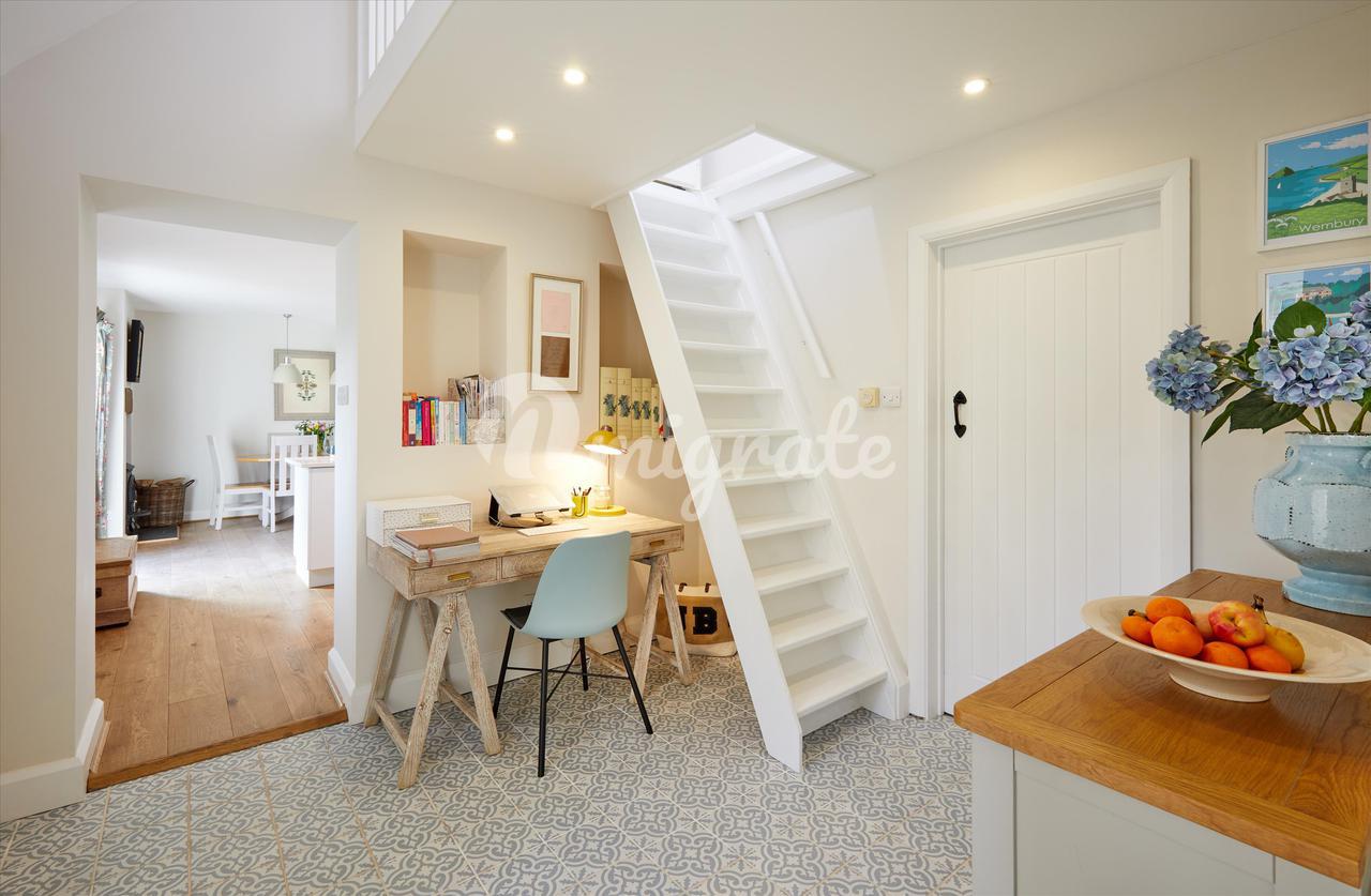 Коттедж представлен в прекрасном состоянии, предлагая хорошее сочетание характерных и современных особенностей. Входное крыльцо ведет в большую приемную с гардеробом и антресольным кабинетом. Кухня/комната для завтрака находится за пределами холла с продолжающимся дубовым полом и дровяной печью, рядом тумб и навесных шкафов со встроенной бытовой техникой и дверями, ведущими в сад.