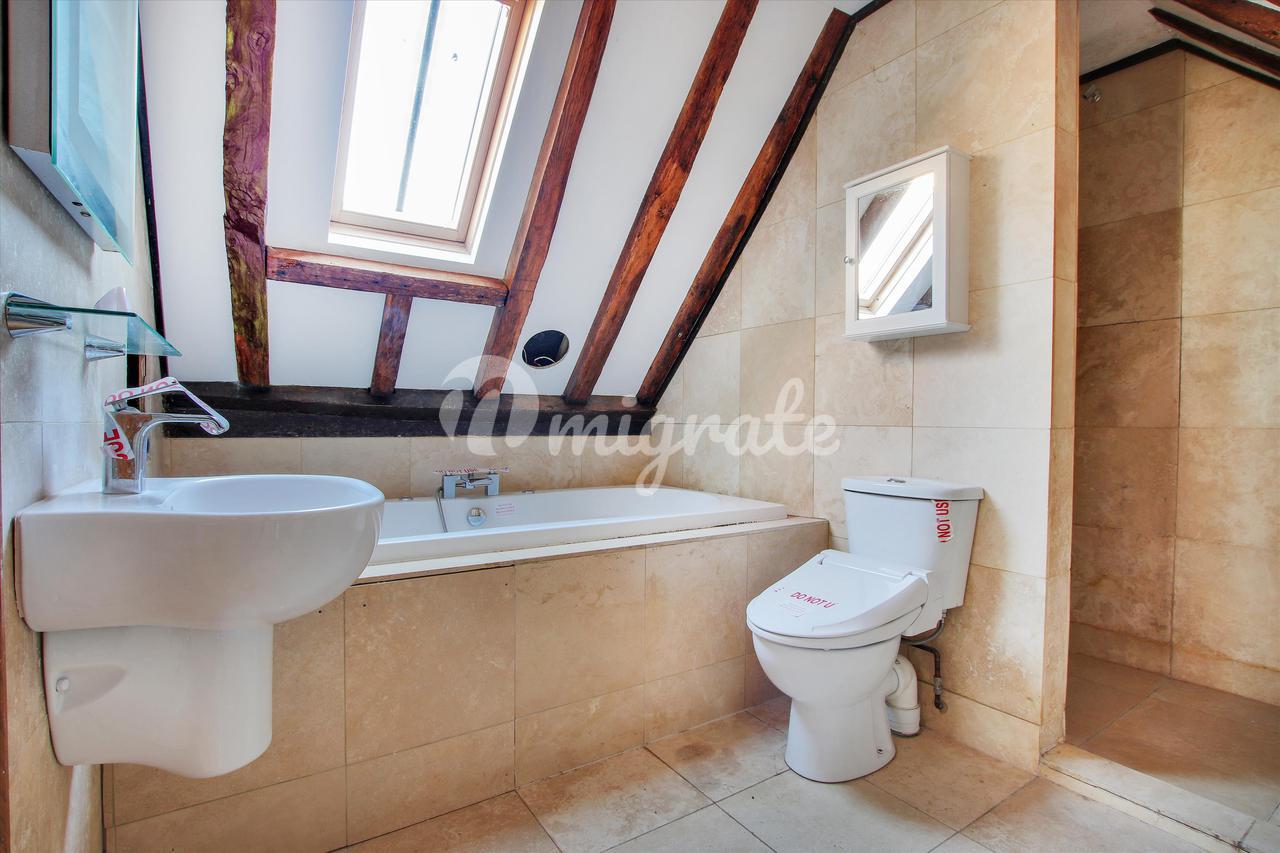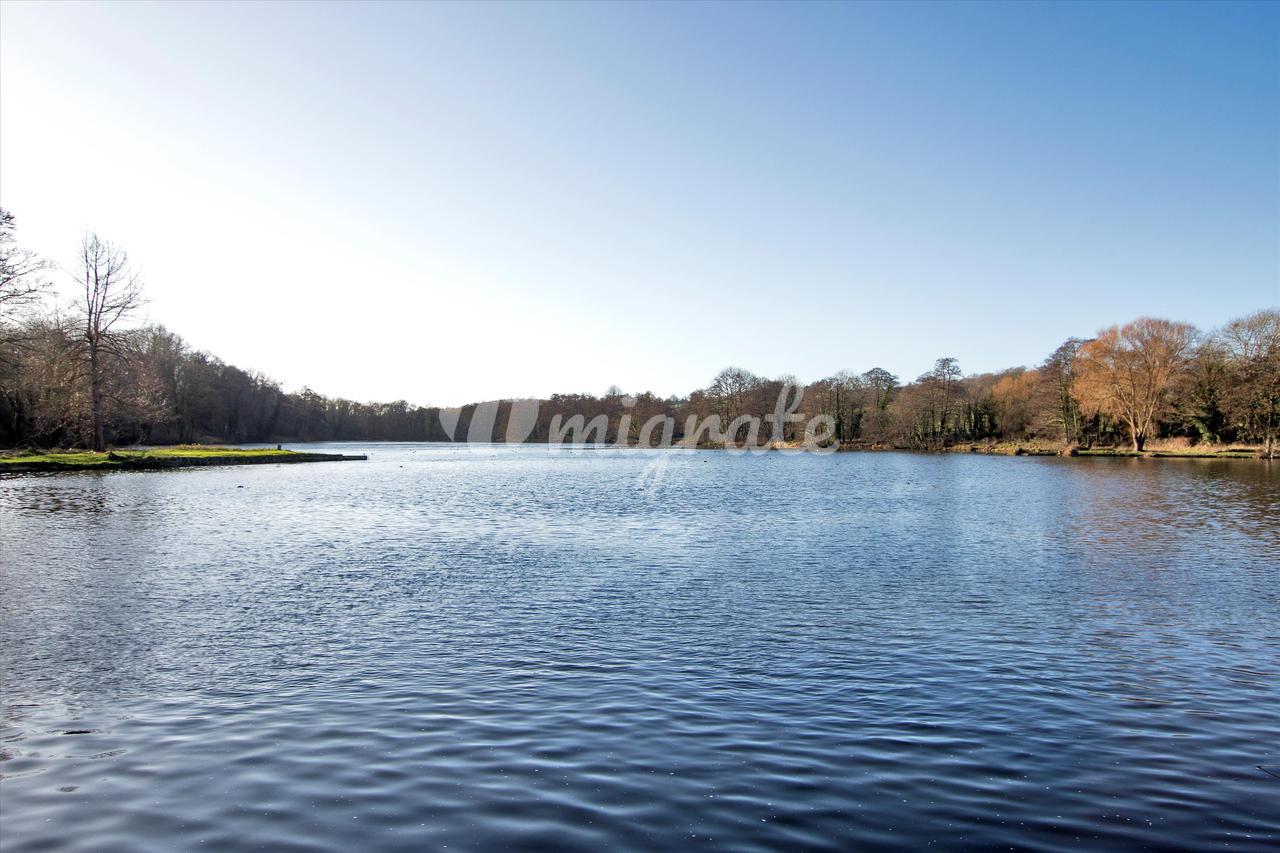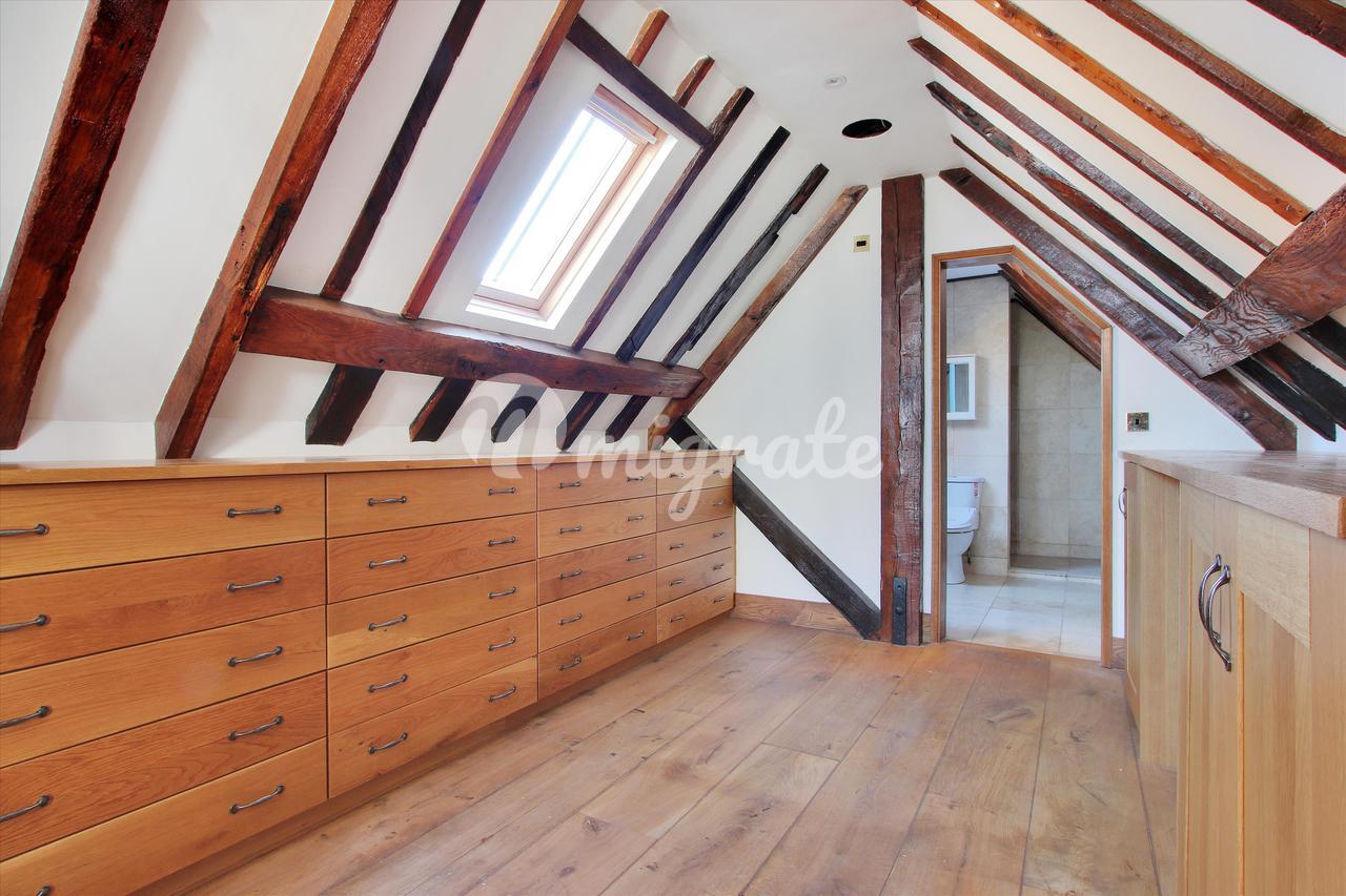 Главная лестница ведет на второй этаж, где просторная гостиная с карнизным потолком и обшитыми панелями стенами с радиаторами в старинном стиле и широкими дощатыми дубовыми досками пола смотрит через застекленные окна во всю высоту прямо на замковое озеро, а полулестница ведет в большую кухню. /завтрак/столовая с оригинальными потолочными балками, снова с прямым видом на озеро. На половине лестничной площадки расположены две спальни с общей ванной комнатой, одна с прилегающей гардеробной, а другая в качестве гибкой спальни / уютной семейной гостиной.