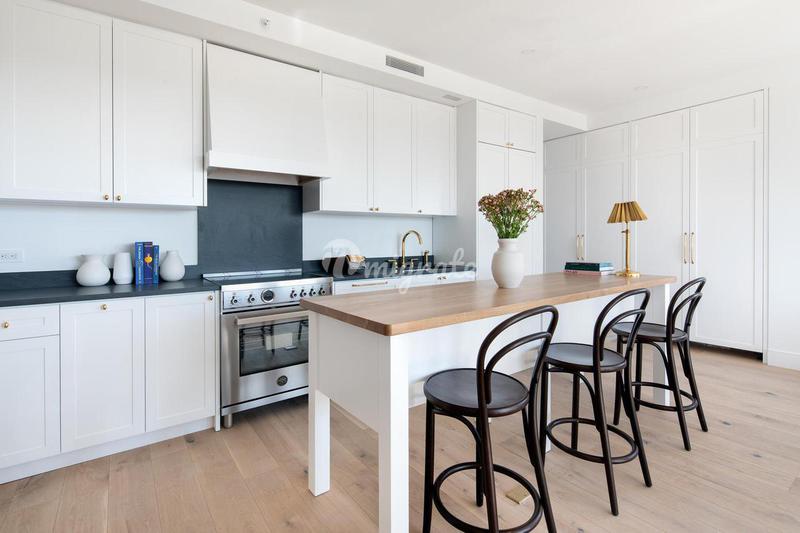 Залитая солнечным светом кухня имеет обширное место для хранения и рабочее место, а также достаточно просторна для большого обеденного стола.