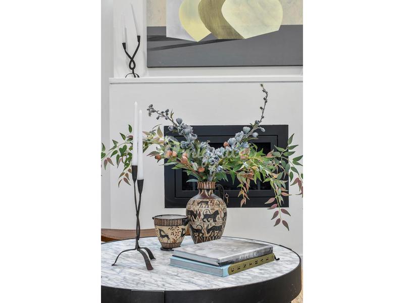Во всем этом роскошном современном доме архитектурные детали изобилуют дощатыми полами шириной 12 дюймов из пихты Дугласа, сочетающейся с пихтой по объединяющим шкафам, включая встроенные раздвижные и складные двери. Стена плавно открывается, открывая широкоэкранный телевизор, закрытая, коллекция скульптур раскрытый.