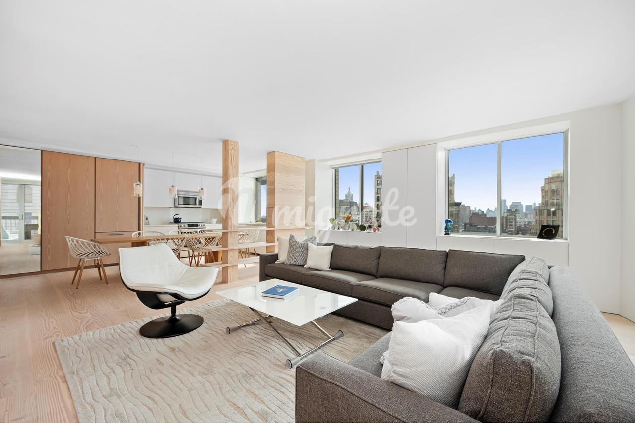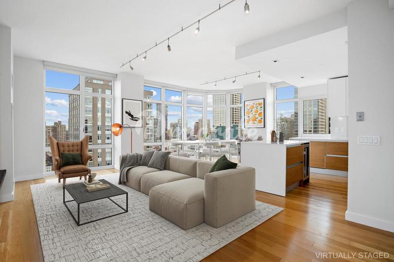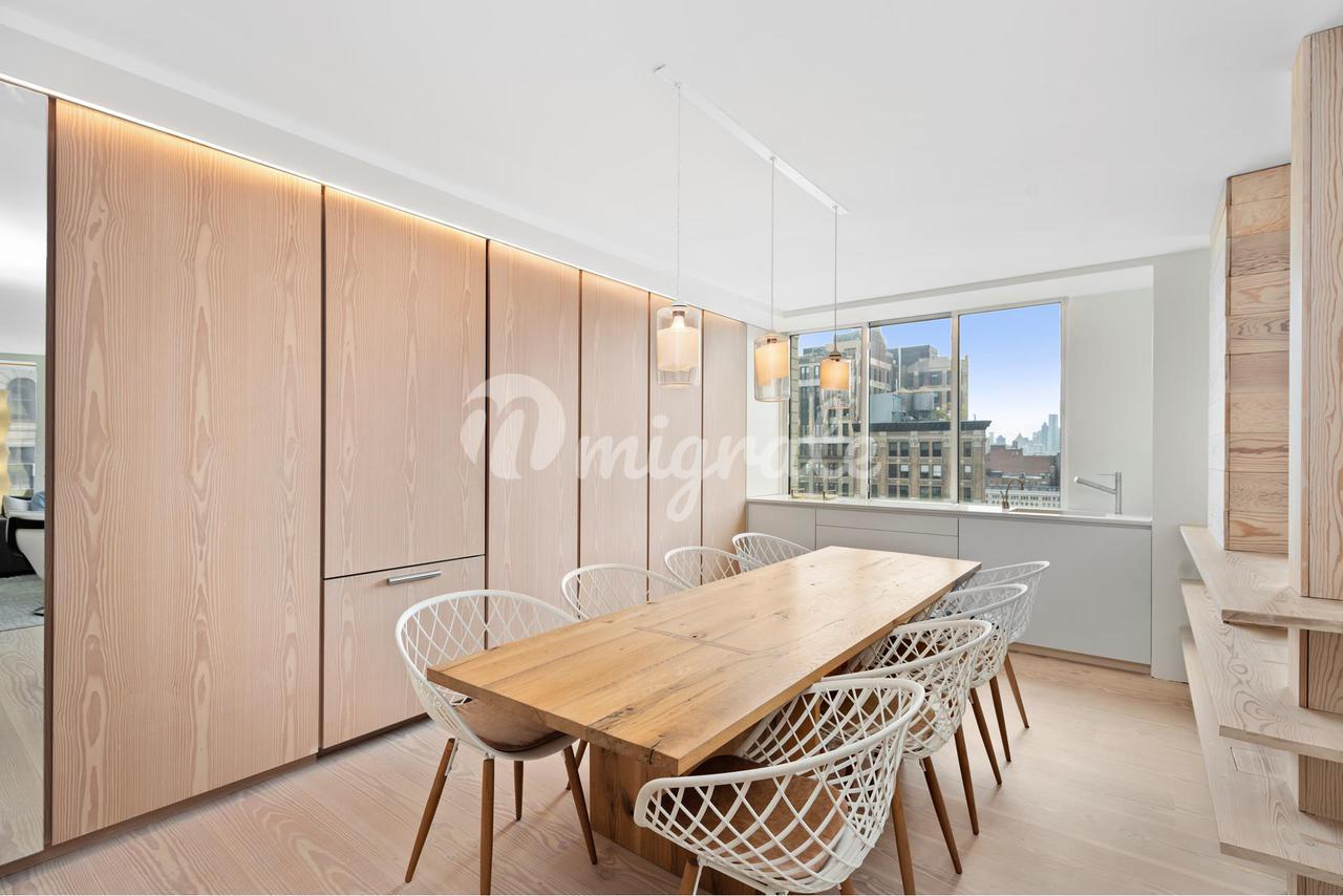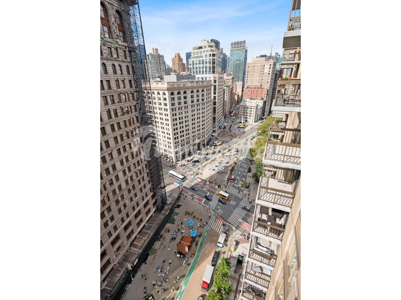 SPACE LIGHT VIEWS SERENITY AMENITIES на 24-м этаже, юго-западный угол дома, спроектированный всемирно известным архитектором. Просторный дом с одной спальней и двумя ванными комнатами, бывший 4,5-комнатной квартирой, был преобразован. Жилая площадь растянута и открыта для еды на кухне. Блестящий дизайн включает в себя окна от стены до стены, солнце и потрясающие виды, в том числе здание Флэтайрон и широкие виды на город.