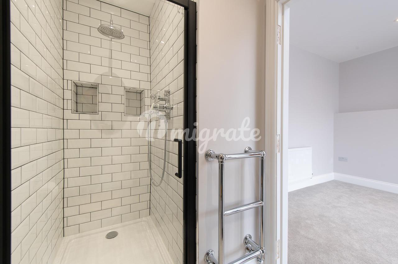 На втором этаже находится просторная главная спальня с видом на фасад, эркером с сиденьем у окна, гардеробной и собственной душевой комнатой. Есть еще две спальни с двуспальными кроватями, спальня с односпальной кроватью / детская / кабинет и роскошная семейная ванная комната. В семейной ванной комнате есть ванна с откидной крышкой, тропический душ, две раковины с туалетным столиком внизу, полотенцесушитель и кафельный пол.