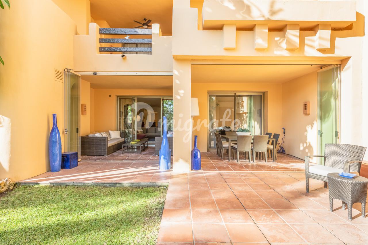 Квартира расположена на первом этаже и имеет прямой выход в сад и находится в уединенном и тихом месте в комплексе. Он состоит из гостиной/столовой, полностью оборудованной кухни с прачечной, двух спален, 2 ванных комнат и красивой полукрытой террасы, частично закрытой стеклянными шторами.