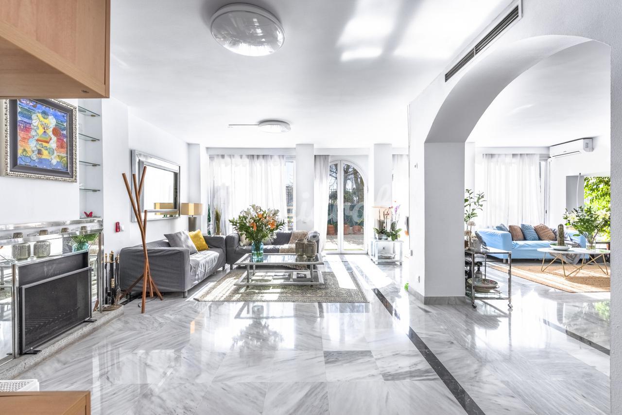 На верхнем этаже находится главная спальня со стеной со встроенными шкафами, крытая терраса с видом на внутренний дворик внизу и на улицу, а также отделанная мрамором ванная комната с естественным освещением. Вторая спальня с ориентацией на юг имеет собственную мраморную ванную комнату с естественным освещением, а третья спальня имеет внутреннюю ванную комнату.