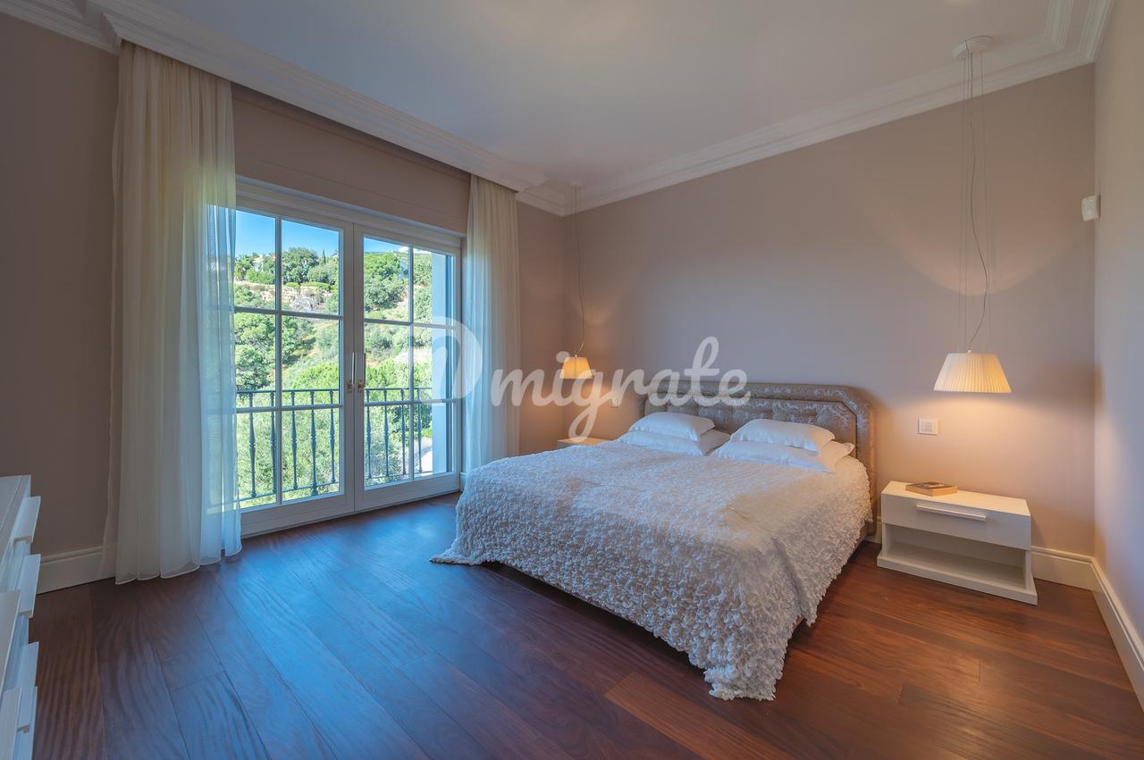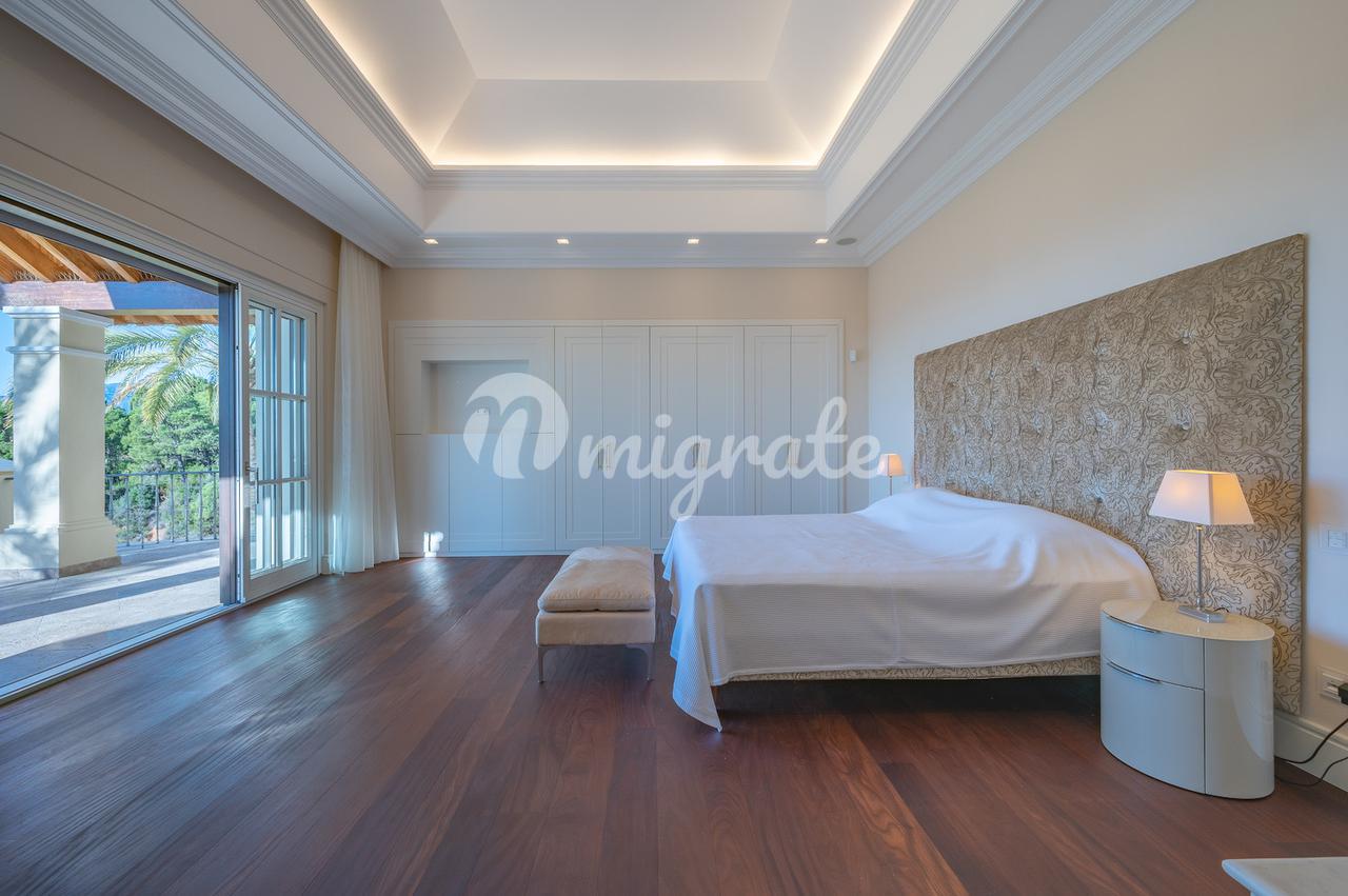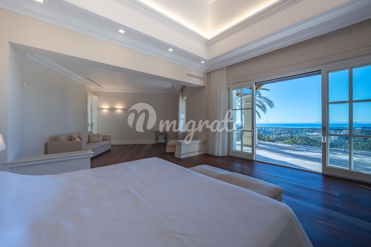 На верхнем этаже расположены 3 спальни. Он распространяется на главную спальню с гардеробной, ванную комнату с цельной мраморной ванной и отдельным тропическим душем. Спальня очень просторная и имеет собственную террасу с видом на море и горный хребет. На этом же уровне есть еще две спальни, одна с душевой комнатой, а другая с ванной.