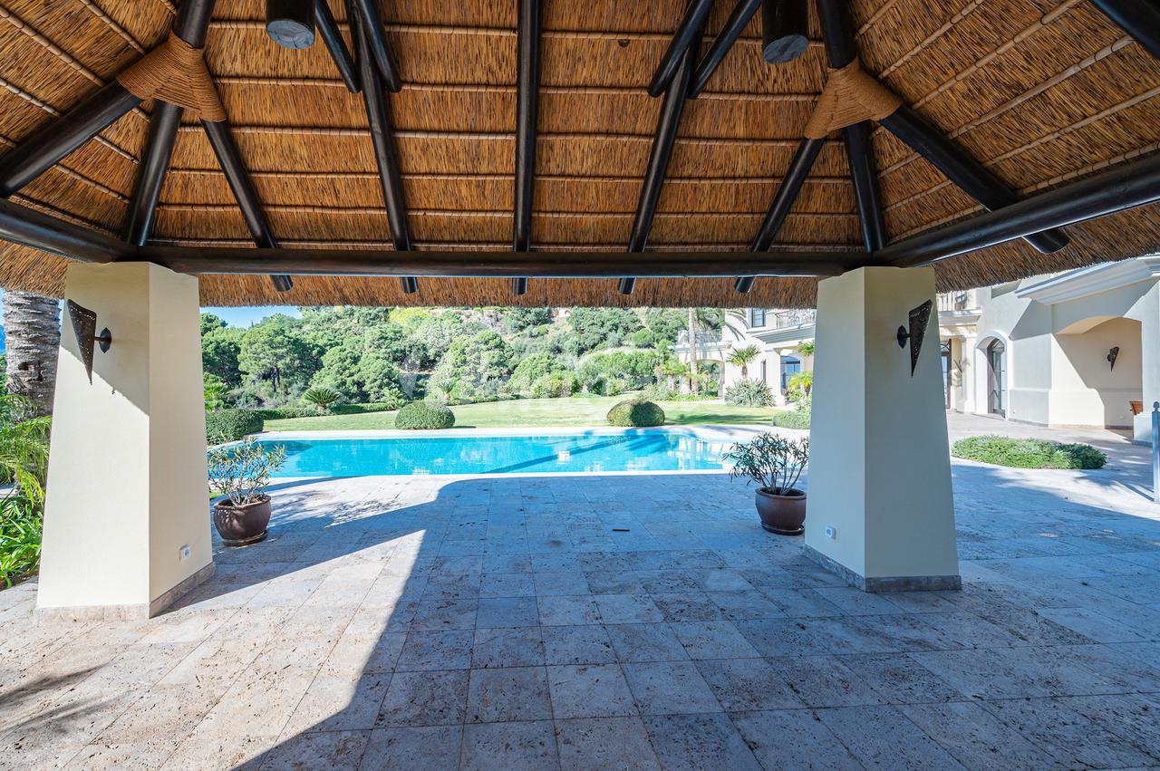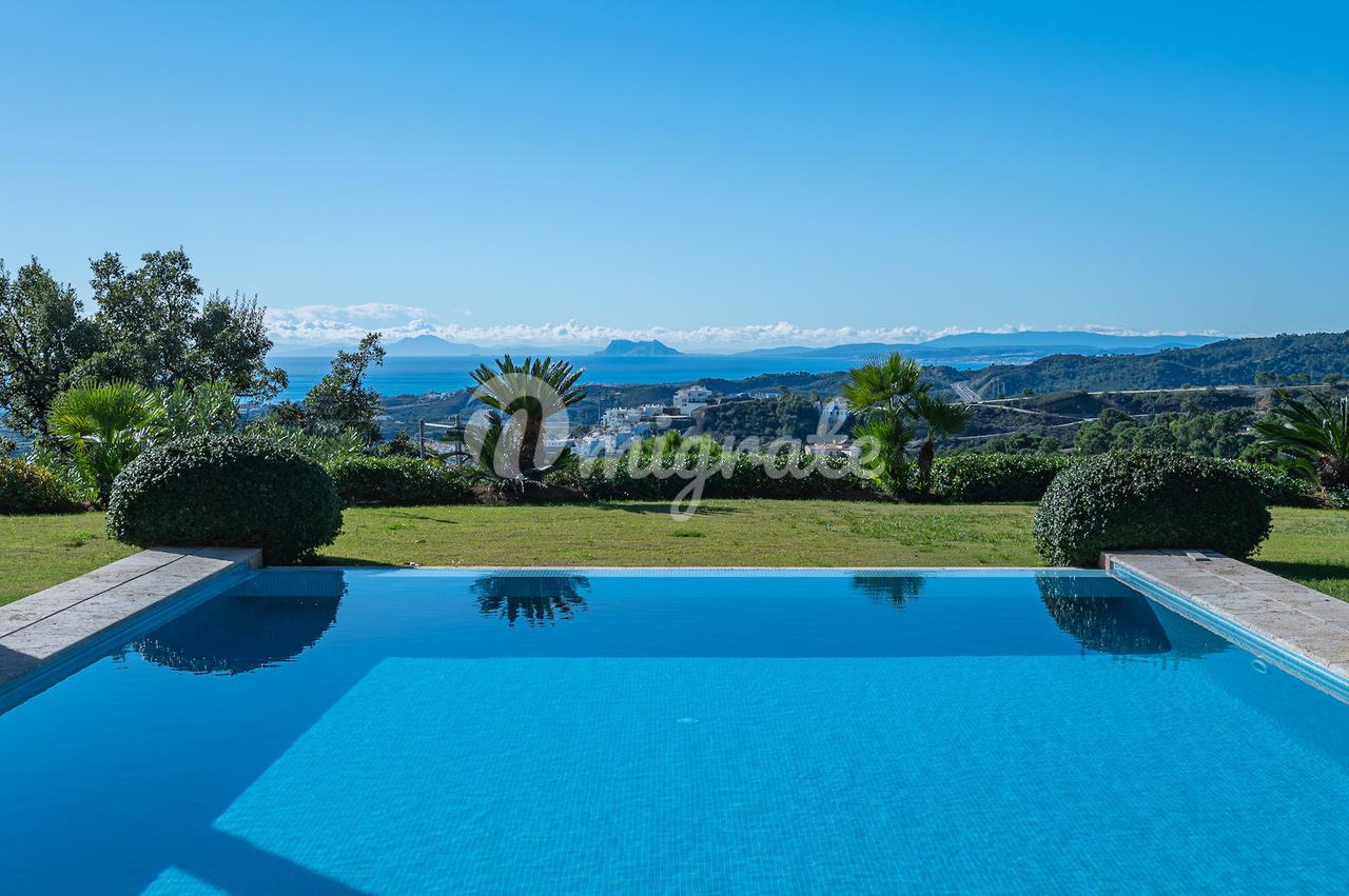 Большой бассейн очищается ультрафиолетовой системой и нагревается за счет энергии, вырабатываемой солнечными панелями. Он также имеет предварительную установку для дополнительной системы отопления. В беседке у бассейна есть джакузи, предварительная установка для мини-кухни и деревянная солнечная терраса.