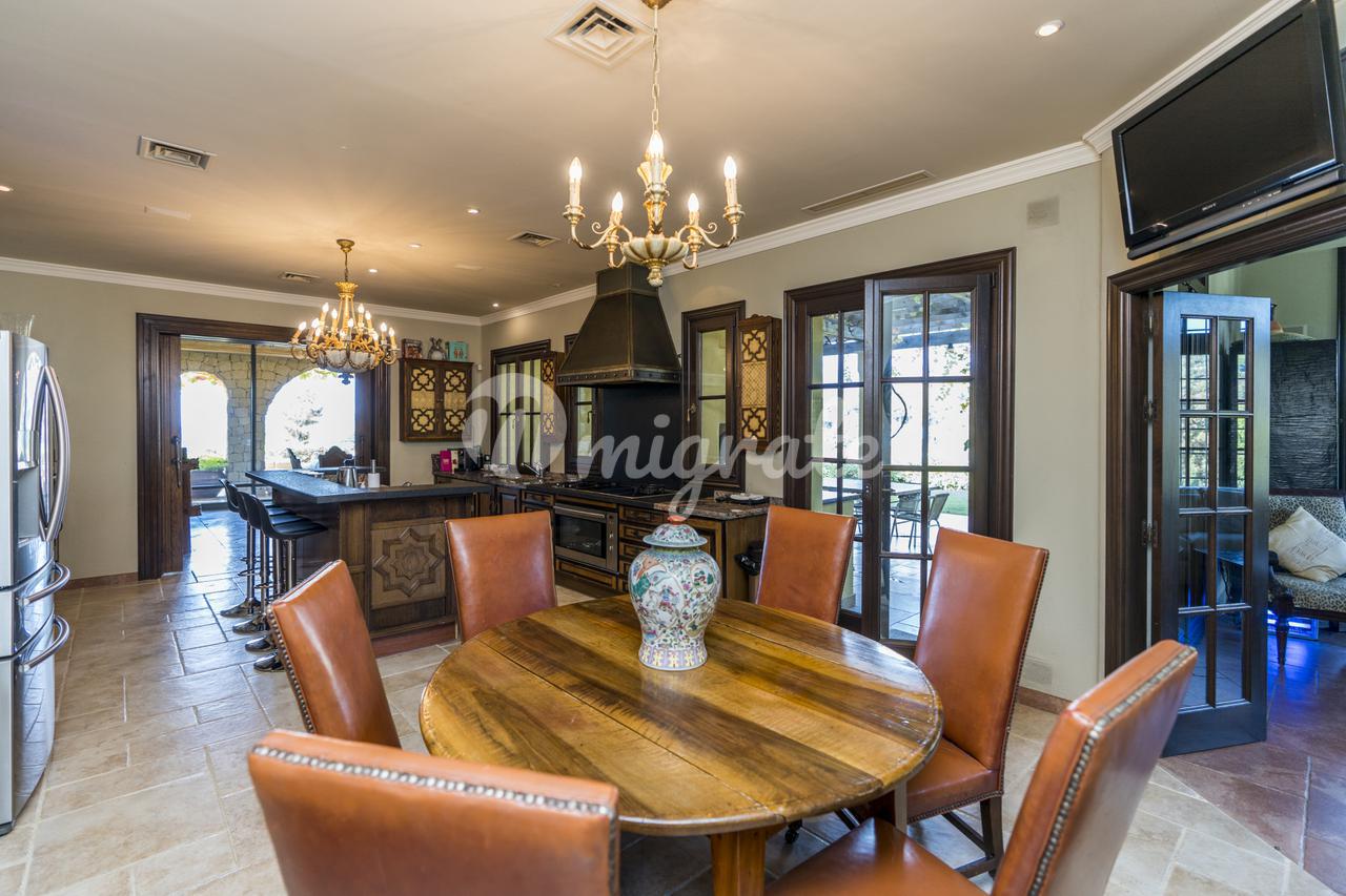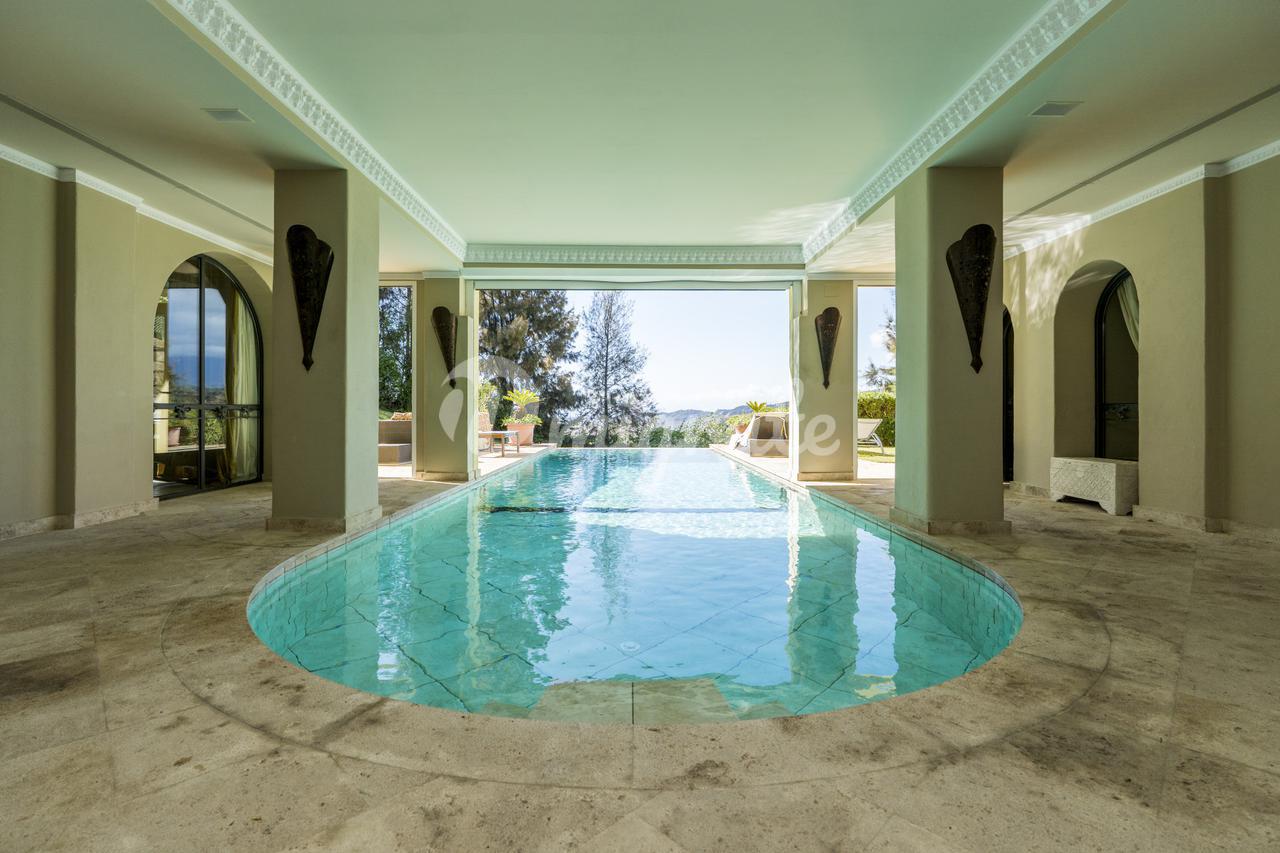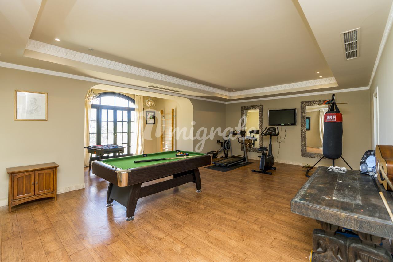 На цокольном этаже и из-за наклона участка находится бассейн, который частично крытый и с подогревом и окружен травертиновым мрамором. Есть две полностью независимые квартиры с кухней, фонтаном и фонтаном, идеально подходящие для персонала или гостей. Спортзал, раздевалки, прачечная, кинотеатр и игровая комната дополняют этот уровень.