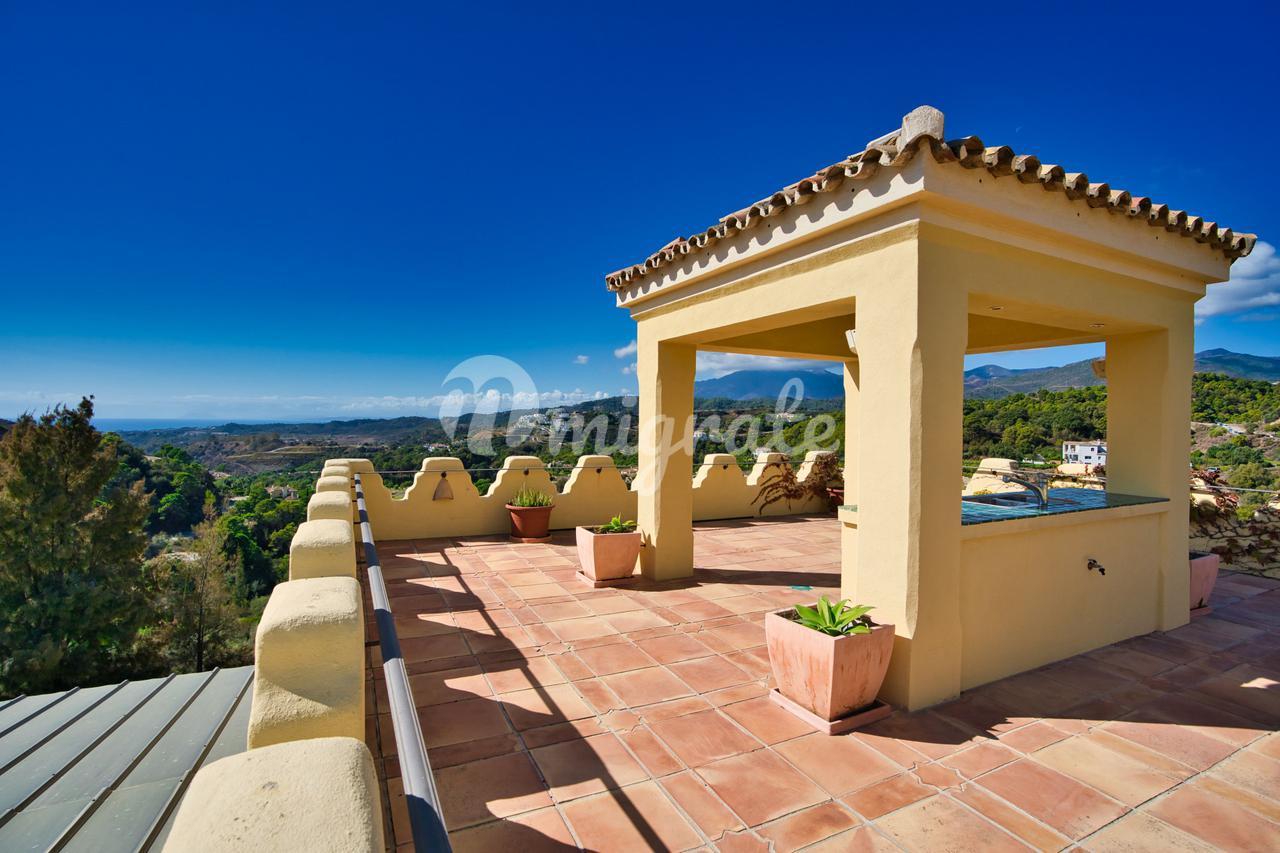 Пентхаус занимает большой солярий с панорамным видом на море, горы и поле для гольфа. В распоряжении гостей практичная кухня на открытом воздухе и различные зоны отдыха и отдыха.