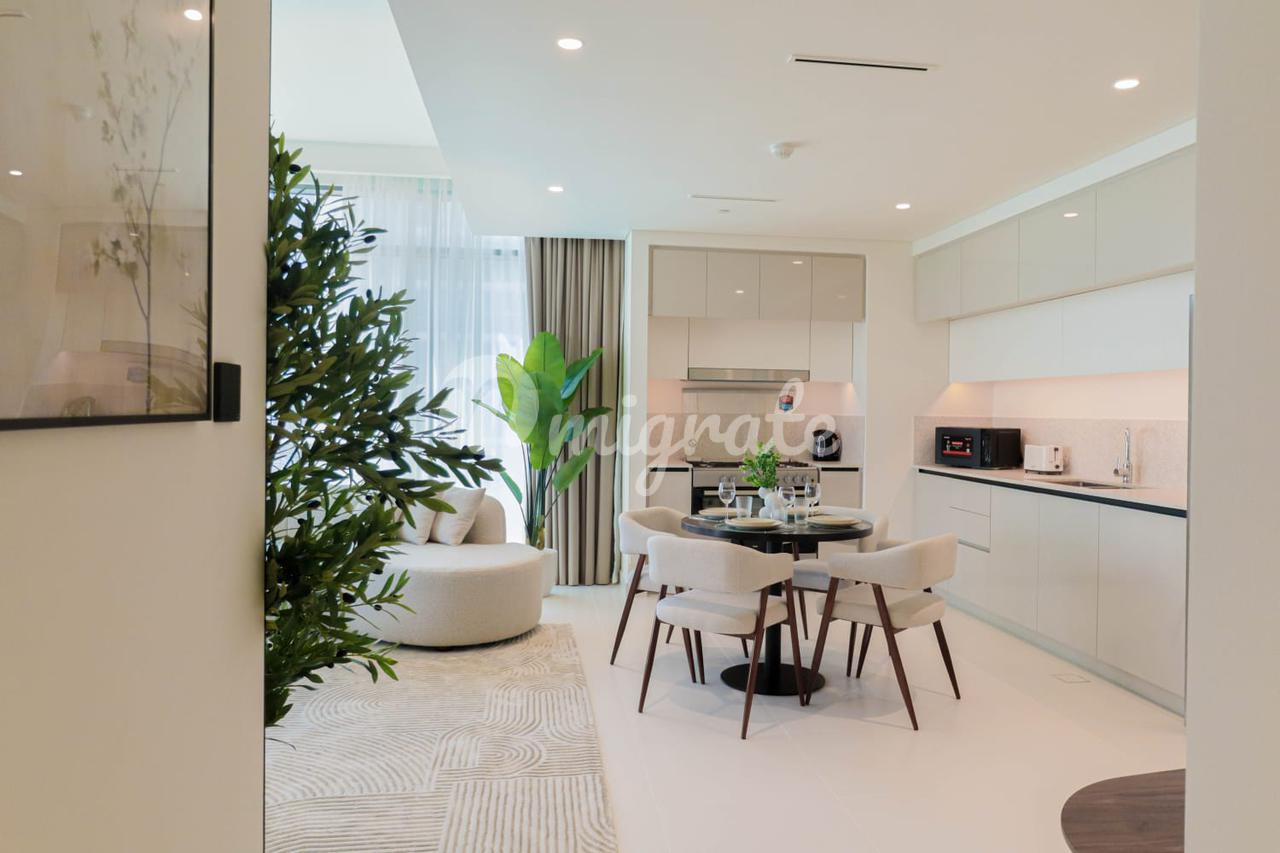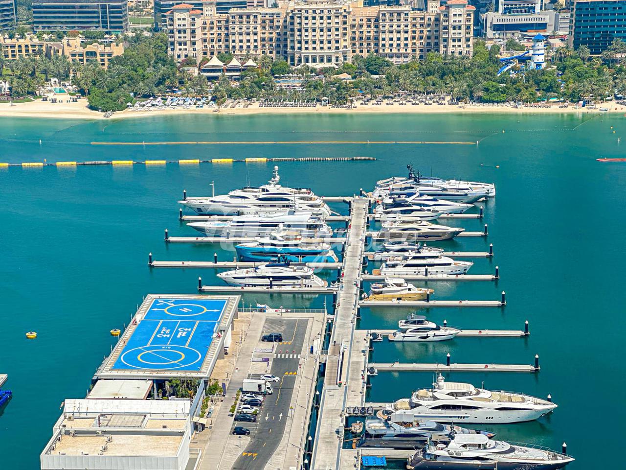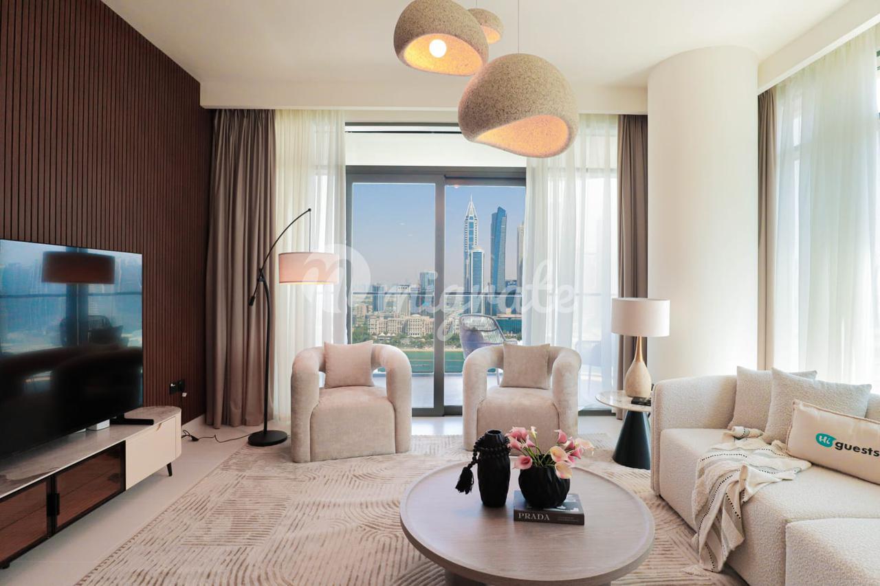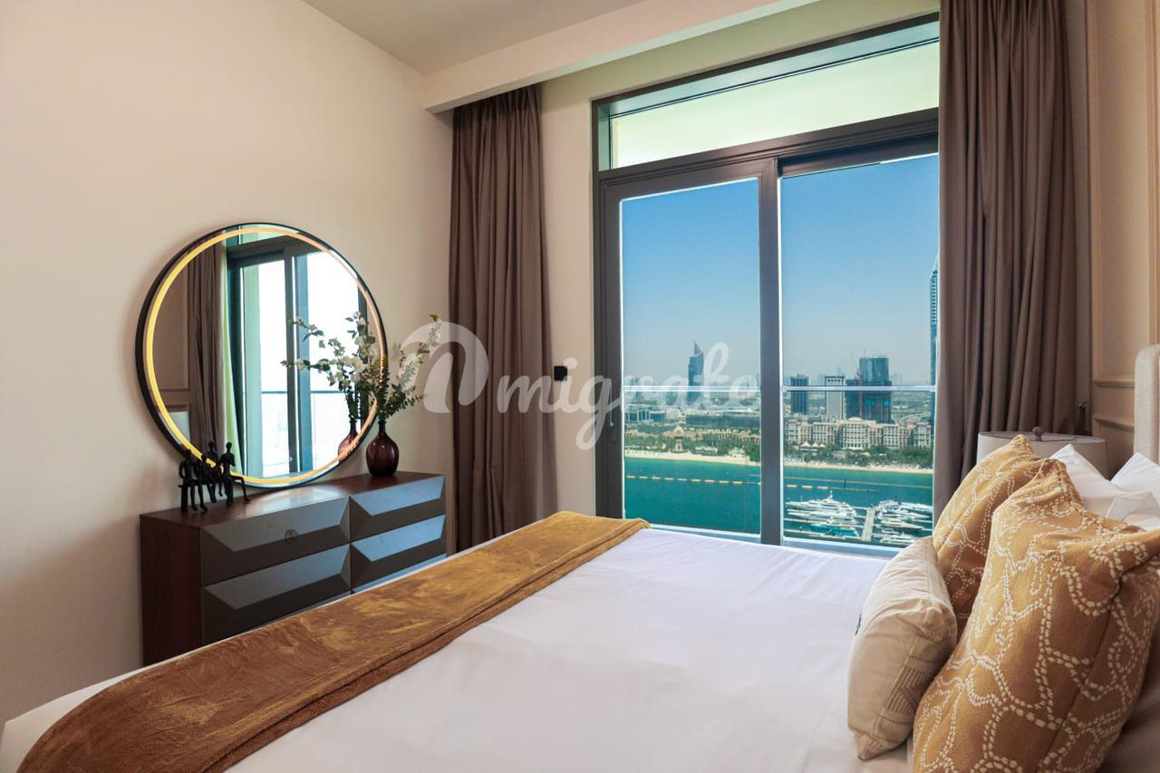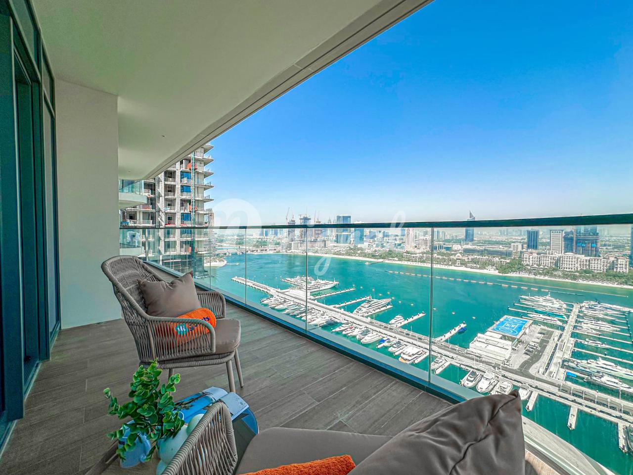 Квартира полностью меблирована и готова к заселению. Из панорамных окон и с балкона открывается вид на Пальмовый остров и район Bluewaters с колесом обозрения Ain Dubai.