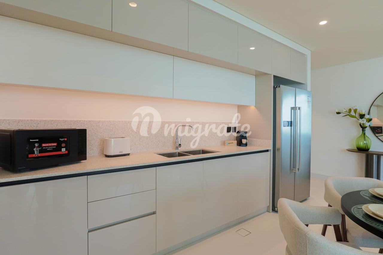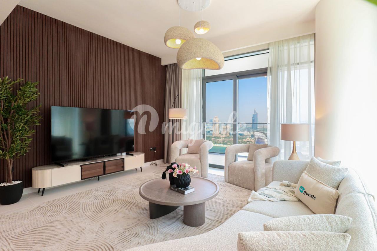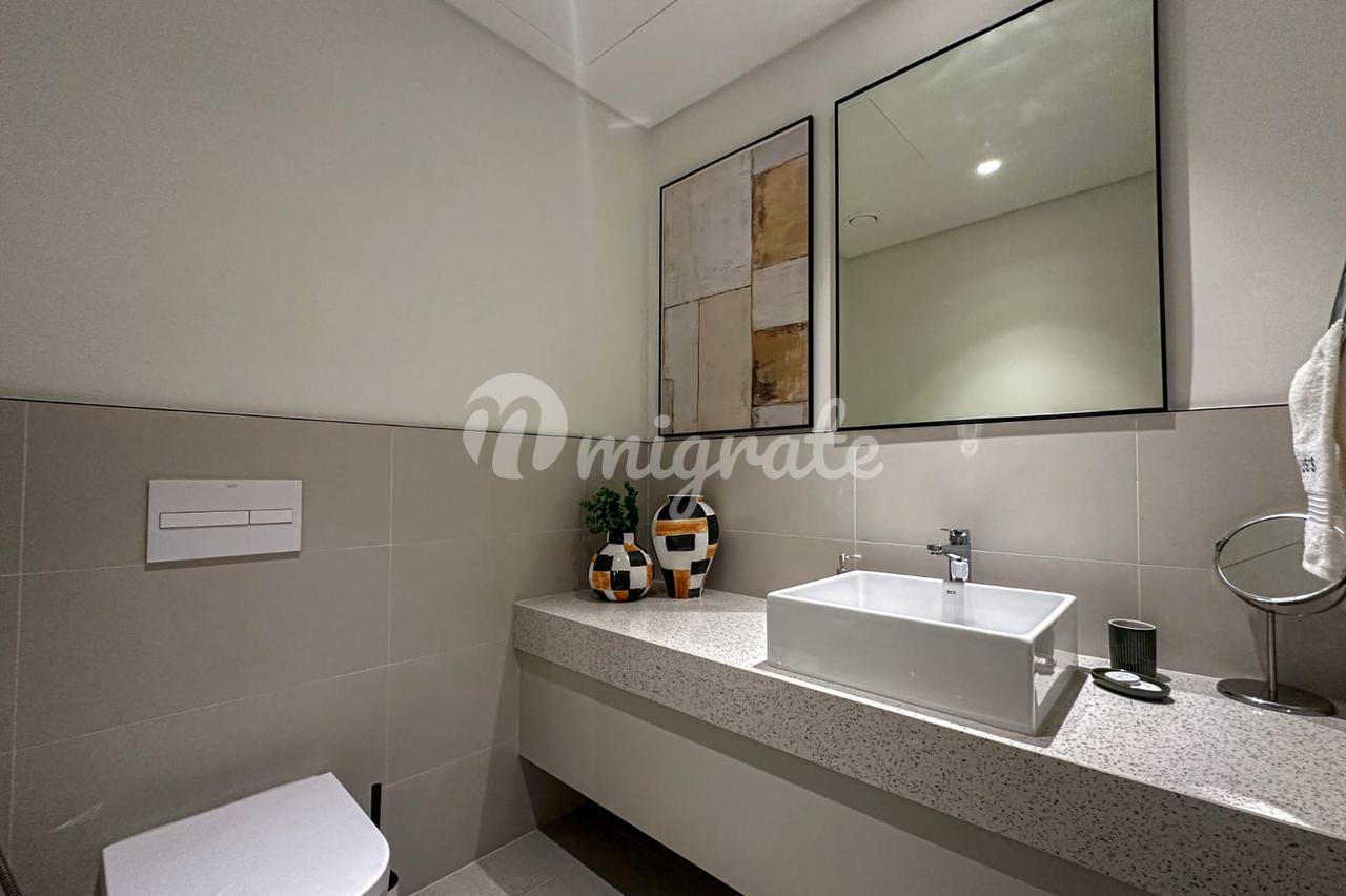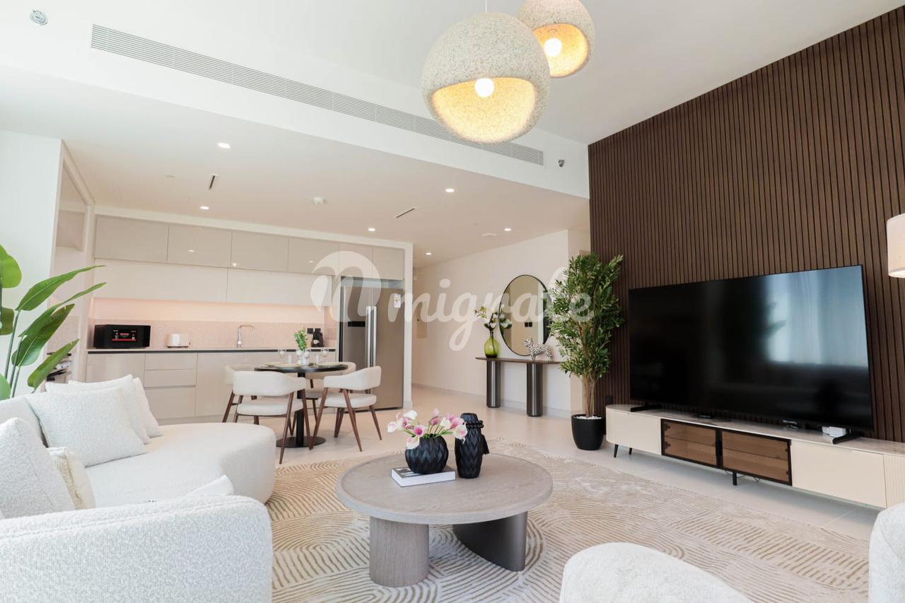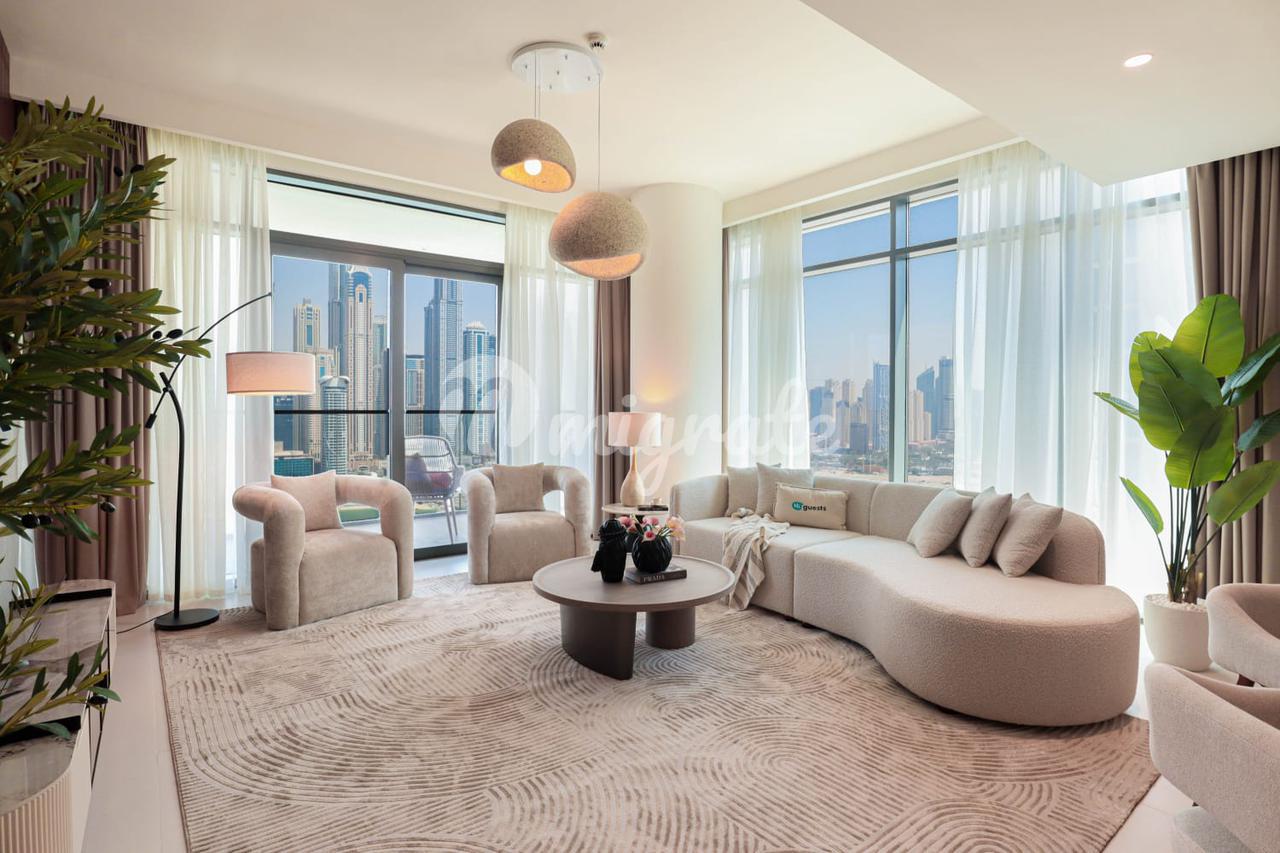 Квартира полностью меблирована и готова к заселению. Из панорамных окон и с балкона открывается вид на Пальмовый остров и район Bluewaters с колесом обозрения Ain Dubai.