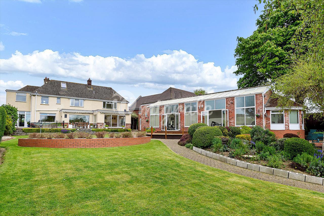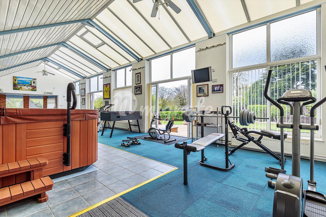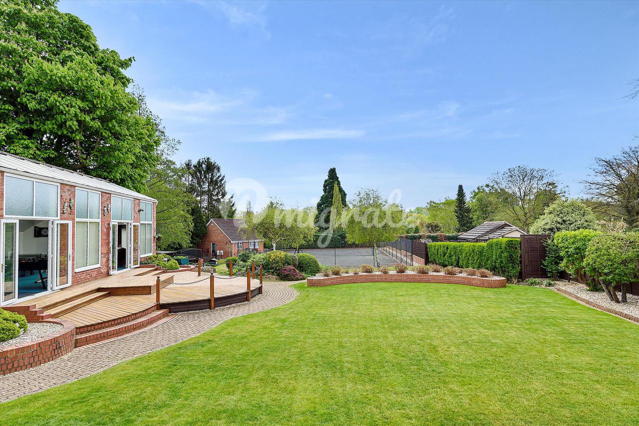 Снаружи находится обширная парковка с доступом к трехместному гаражу. На юге находится прекрасный частный сад с обширной лужайкой, ведущей вниз к теннисному корту, родниковому ручью с защищенной грядкой кресс-салата и мостиком через него, ведущим к отдельно стоящему отдельностоящему дополнительному бунгало. В бывшем комплексе с бассейном расположены тренажерный зал, гидромассажная ванна и обширная зона, идеально подходящая для развлечений, а также раздевалка, душевая комната и туалет.