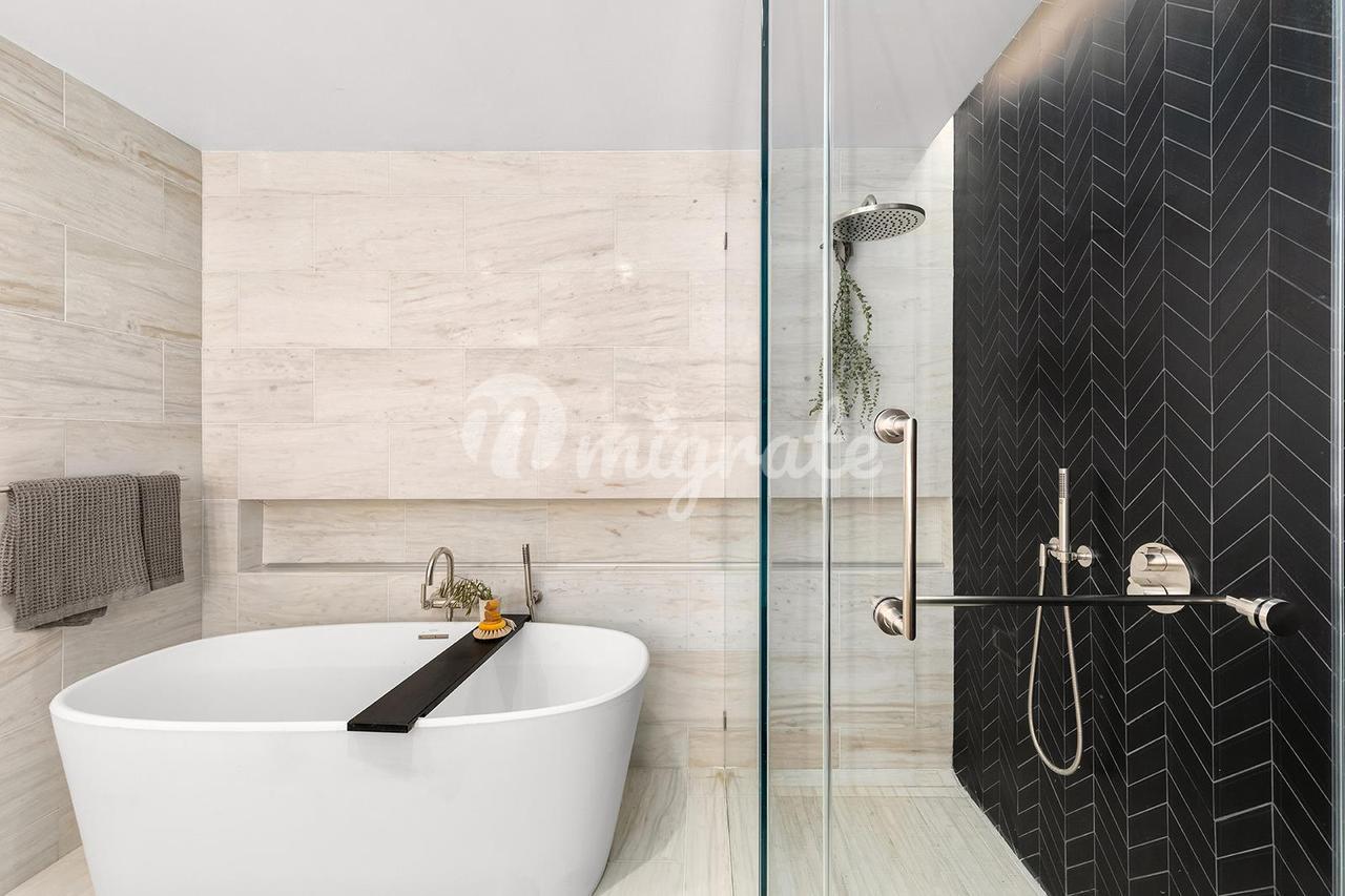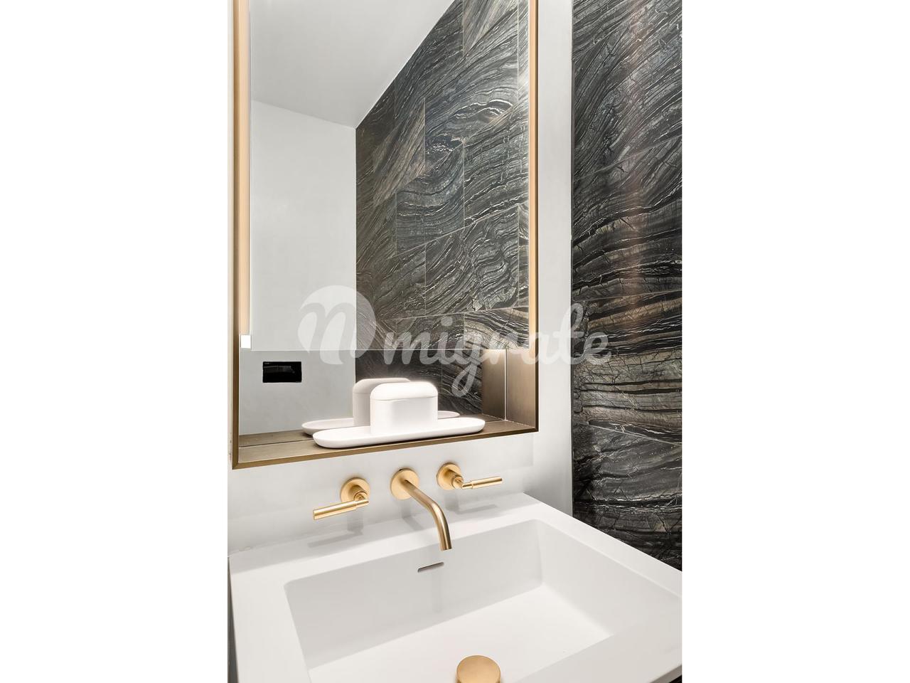В главной спальне есть два исключительно больших шкафа-купе и отдельная гардеробная, когда вы направляетесь в смежную ванную комнату. Отдельно стоящая ванна для купания с отдельным застекленным душем, полы с подогревом и полы из белого мрамора с отделкой из черного фарфора с мозаикой в виде шевронов, изготовленный на заказ зеркальный шкафчик для лекарств с объемным освещением, двойной туалетный столик из белого дуба с бронзовыми ножками, натертыми маслом, с нижней открытой полкой для полотенец, и платиновый матовый в основной ванной комнате установлена необходимая сантехника. Во второй спальне есть смежная ванна с душем, отделанным мрамором Gioia Venato, и выложенными в шахматном порядке стенами из серебристого мрамора Woodgrain. Дополняет предложение шкаф для белья со стиральной машиной и сушилкой Whirlpool.