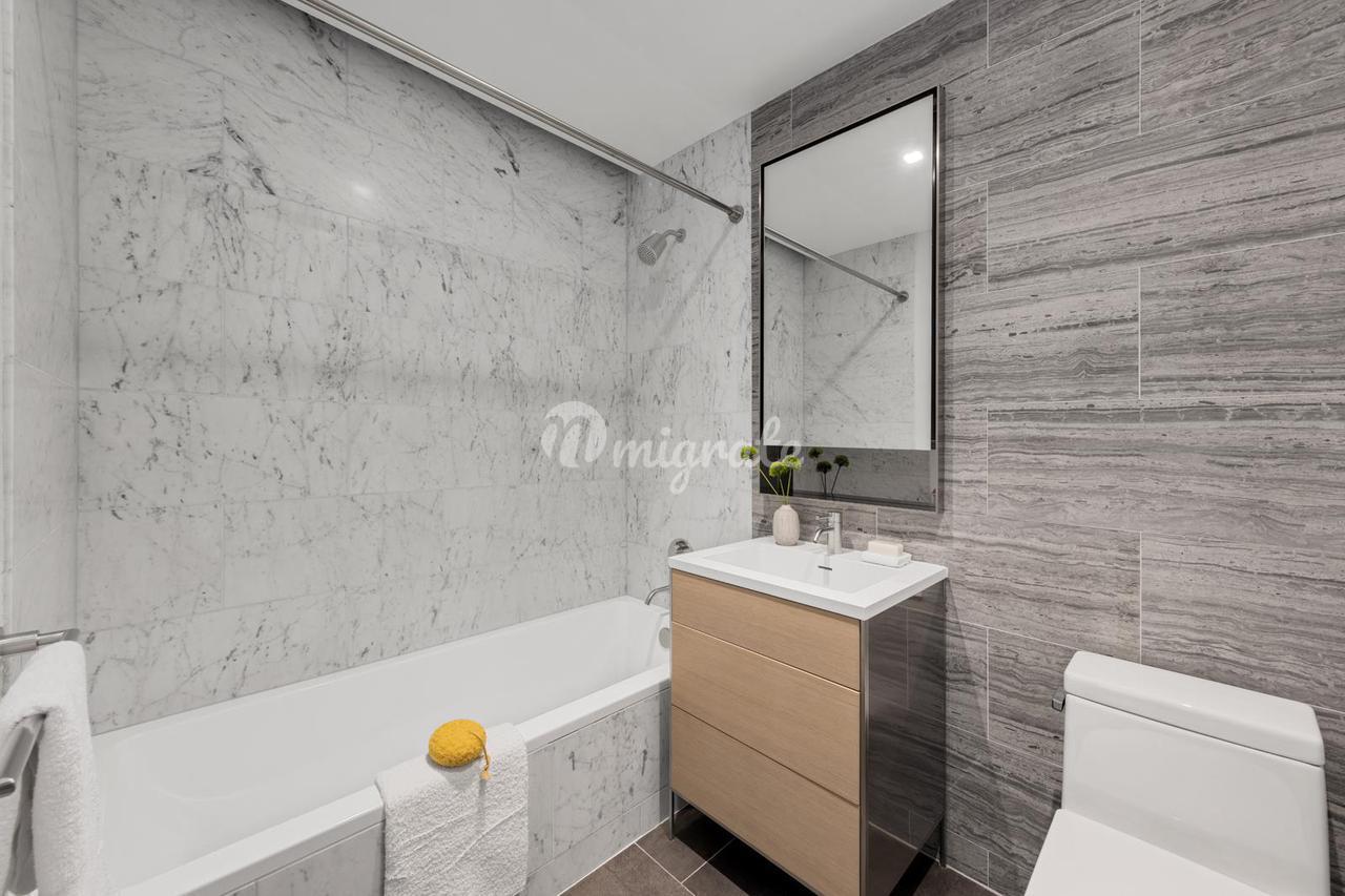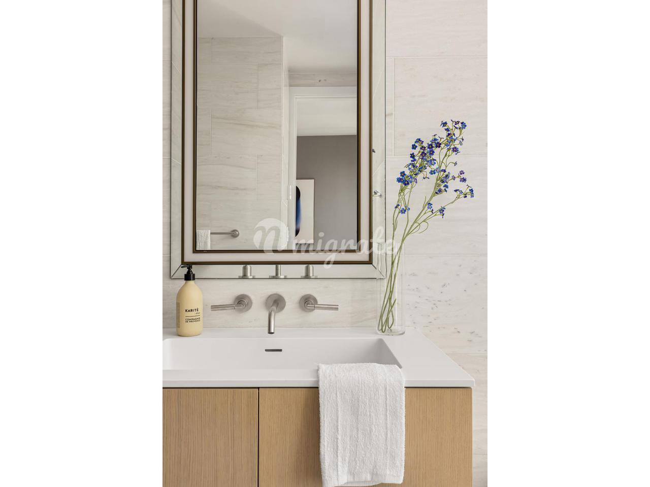 В основном люксе есть два встроенных шкафа и смежная ванная комната с отдельно стоящей ванной для купания и отдельным застекленным душем, полы с подогревом и великолепные полы из белого шлифованного мрамора с черной фарфоровой акцентной стеной с шевронной мозаикой, зеркальная аптечка на заказ с объемным освещением, двойной туалетный столик из белого дуба с масляной подсветкой. -ножки из натертой бронзы с нижней открытой полкой для полотенец и матовой фурнитурой Dornbracht platinum.