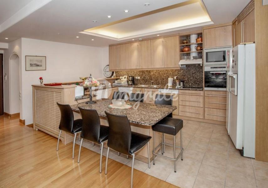 На основном этаже расположена уютная гостиная с камином и выходом на большой балкон, кухня с бытовой техникой бренда Miele и гранитными столешницами, изготовленными на заказ, обеденная зона, 2 спальни с ванными комнатами и балконом с видом на сад.