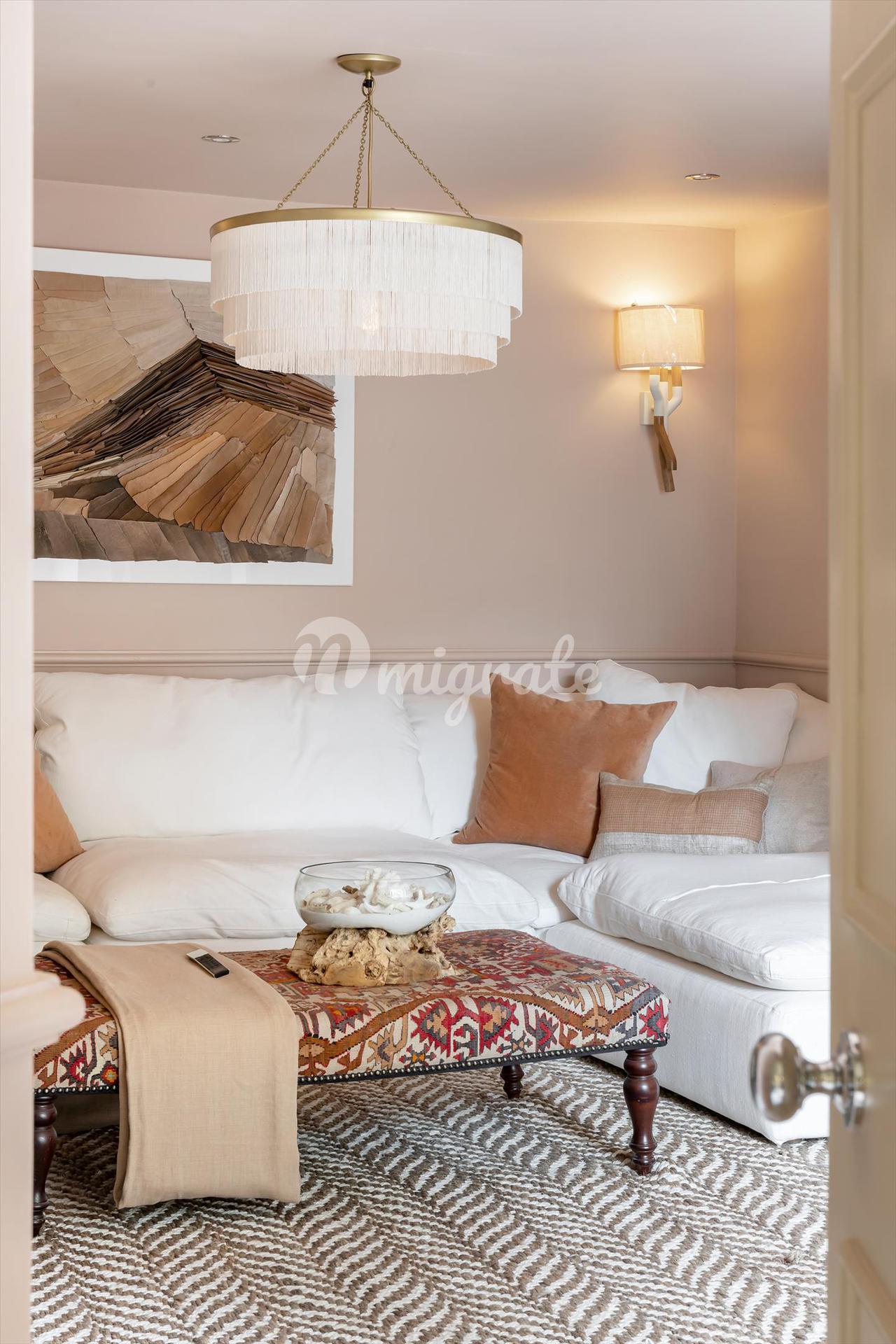 На нижнем первом этаже стены с белыми панелями продолжаются вдоль коридора, который ведет к задней двери и в сад. Здесь есть уютная семейная комната с каменными стенными вставками и не совсем белым полом, выложенным елочкой. Комната имеет большое окно, продуманное освещение и мягкую цветовую палитру, которая создает легкое и удобное пространство. На этом этаже также есть полезная офисная комната (которая также служит прачечной) с видом на внутренний двор с садом, спальня/тренажерный зал и туалет.