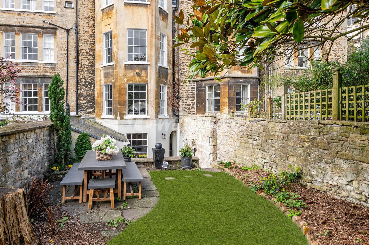 в настоящее время гардеробная с исключительным хранением - и две душевые комнаты. Новая система подачи воды под давлением означает, что душ с сильным напором воды возможен даже на этом верхнем этаже. В саду, обнесенном задней стеной на восточной стороне, есть внутренний двор и небольшой внутренний дворик, большое дерево магнолии и несколько бордюров с кустами.