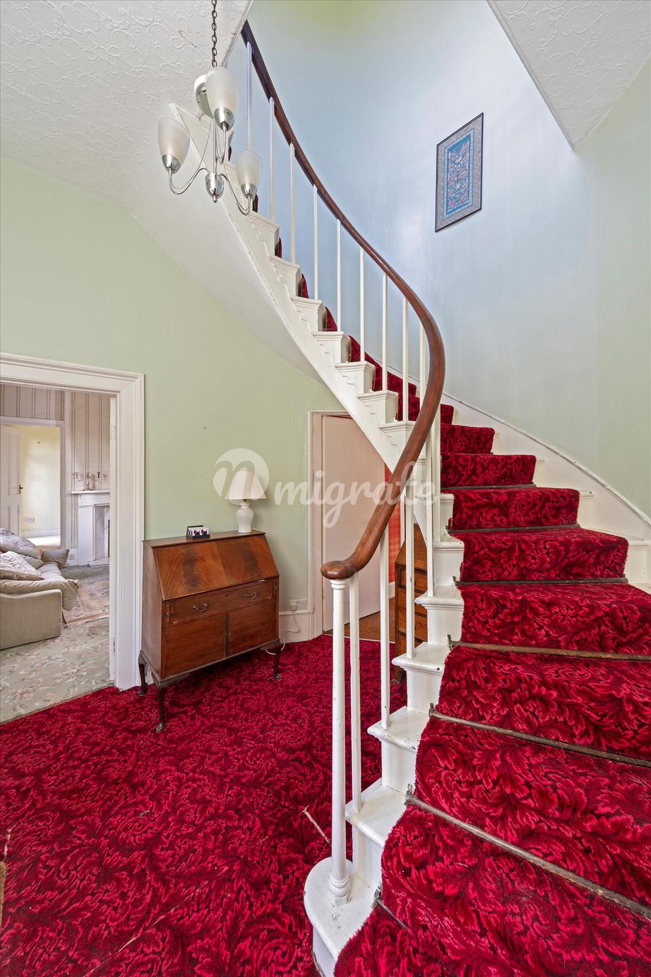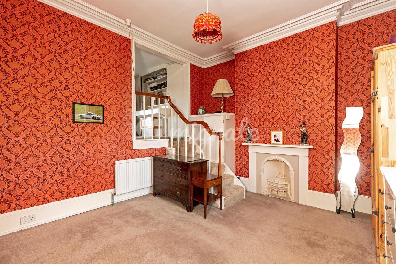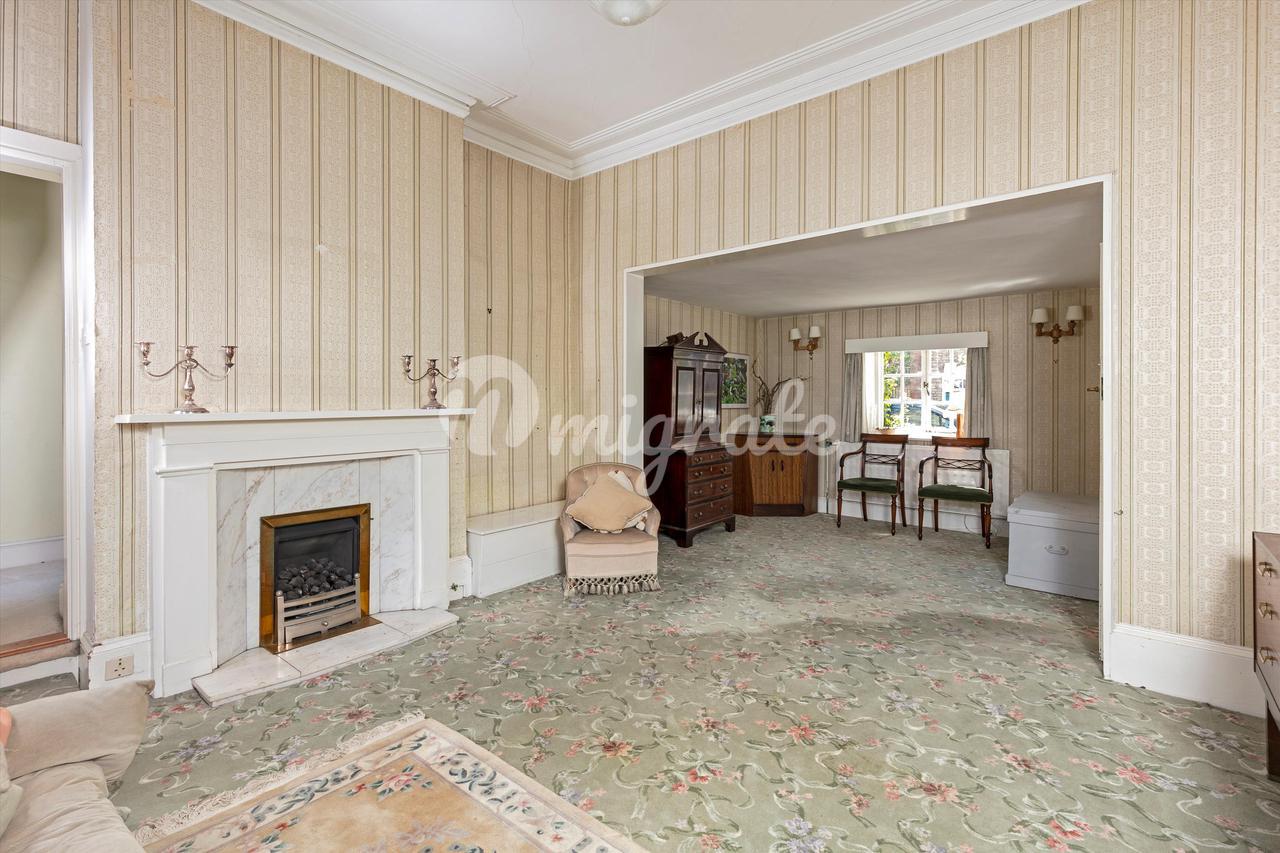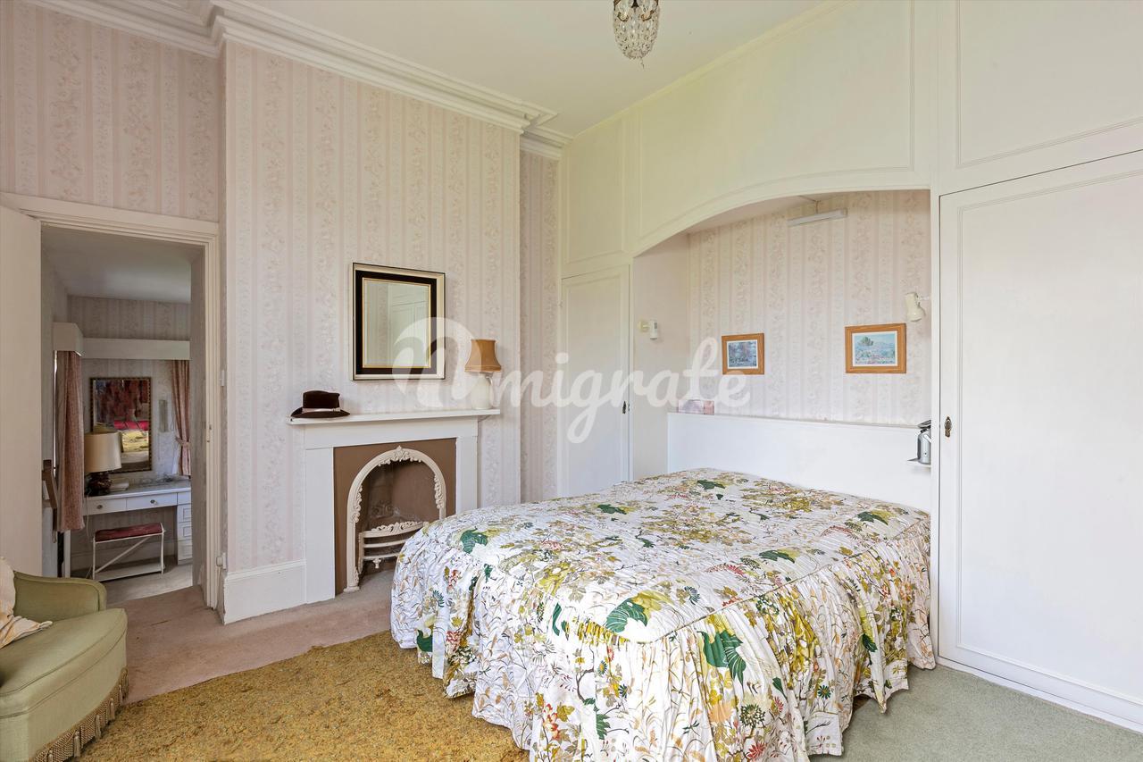 С другой стороны зала находится гостиная, которая имеет двойной аспект, идущий от передней к задней части дома, с камином с чугунной решеткой. Между двумя приемными за лестницей есть необычная связь. Подсобное помещение / подсобное помещение ведет к просторному подвальному складу, в котором также находится газовый котел и винный погреб. За гостиной находится спальня на первом этаже с собственной входной дверью, вестибюль, спальня с двуспальной кроватью 5, гардеробная и ванная комната.
