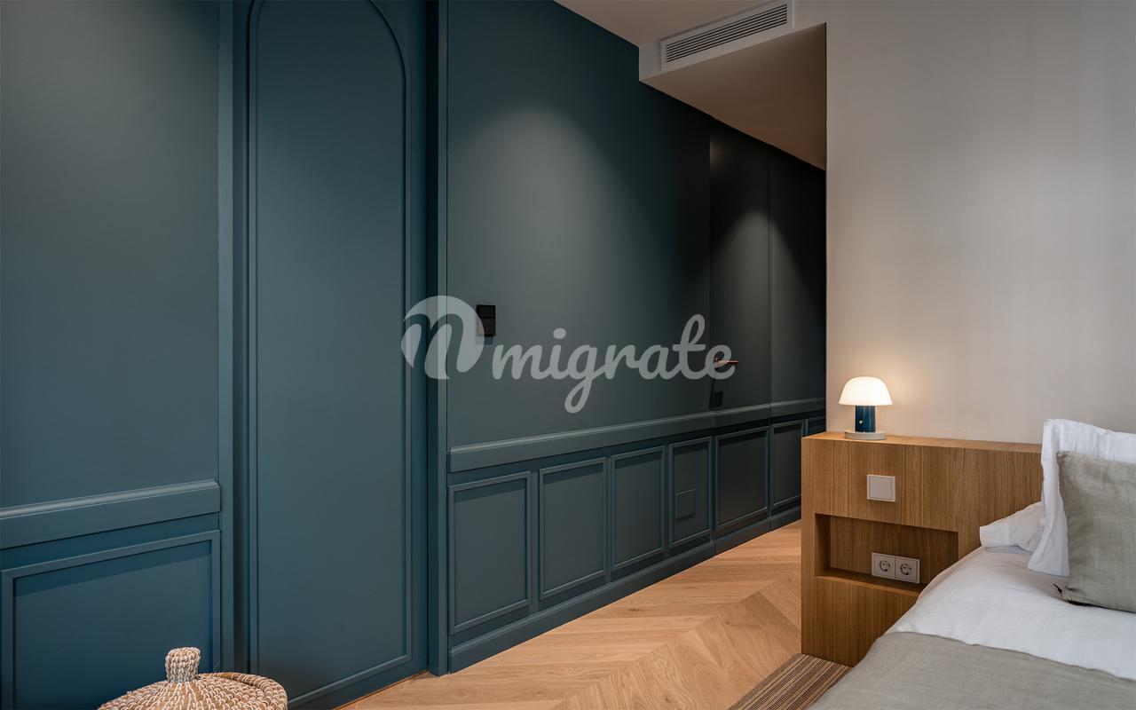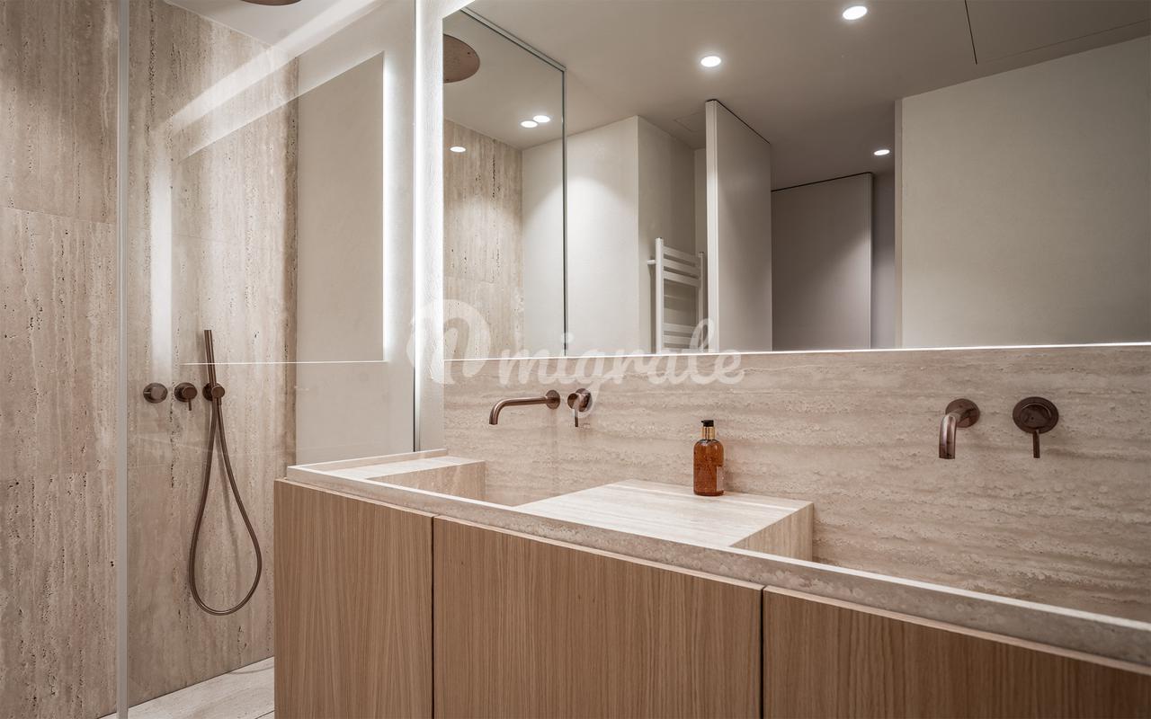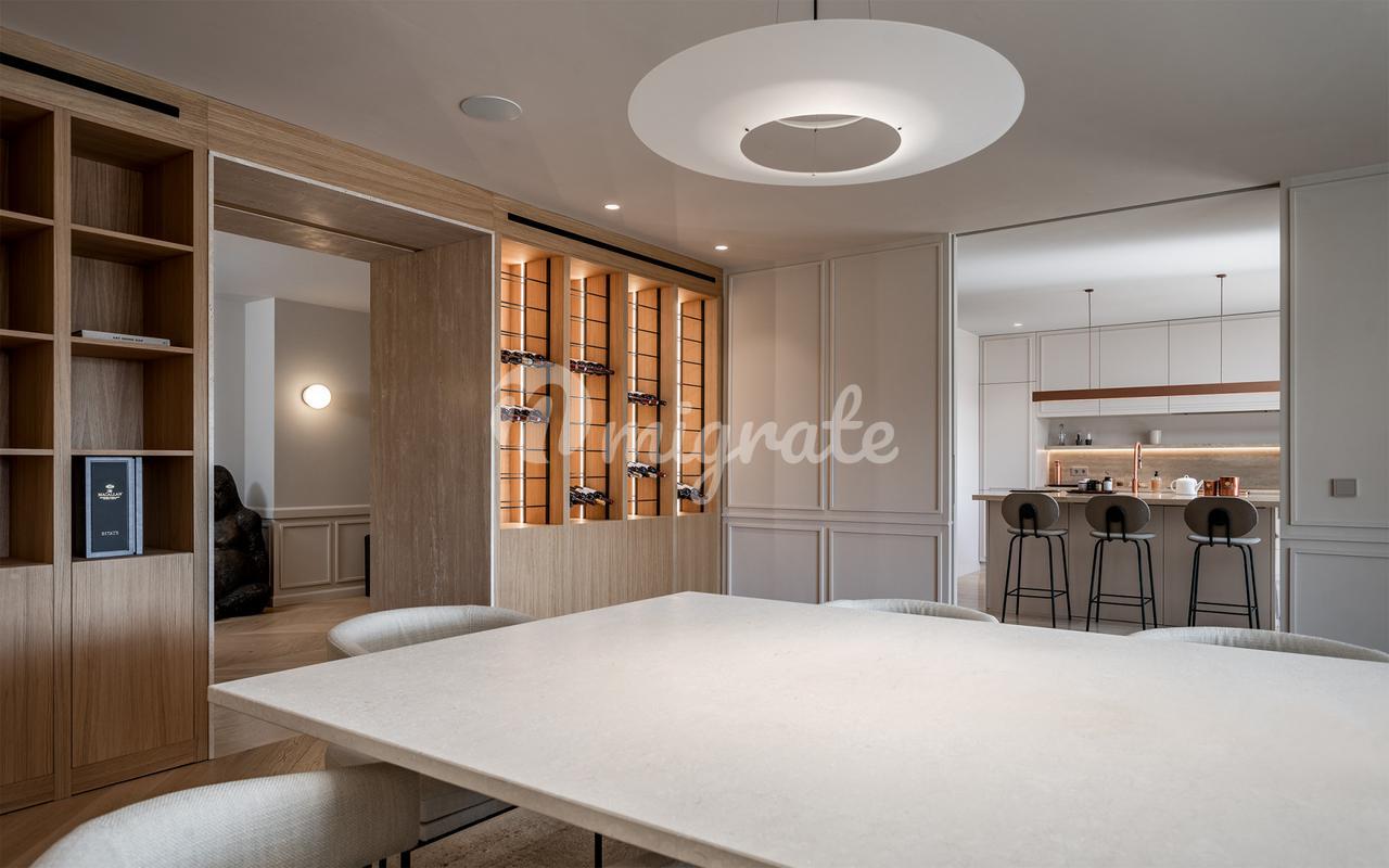 В нем есть четыре просторные спальни с ванными комнатами, отдельная прачечная и кабинет. Гостиная, объединенная со столовой и кухней, имеет площадь около 120 м2, а ее деревянные детали и теплые материалы создают ощущение дома, что делает эту квартиру идеальной для круглогодичного проживания. При ремонте были использованы высококачественные технические характеристики, такие как бытовая техника Miele, полы с подогревом, дубовые полы, система домашней автоматизации, встроенная звуковая система и т.д.