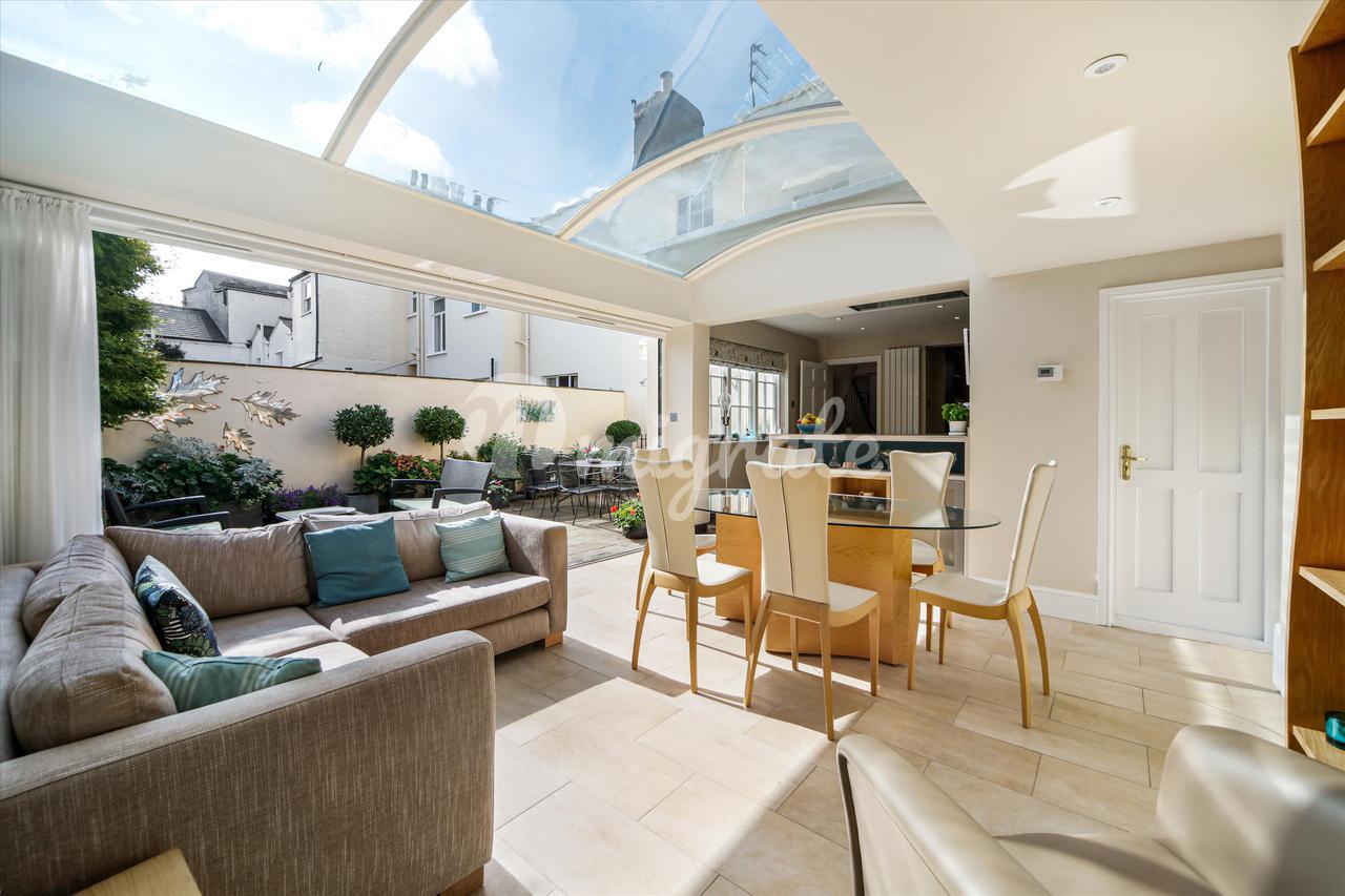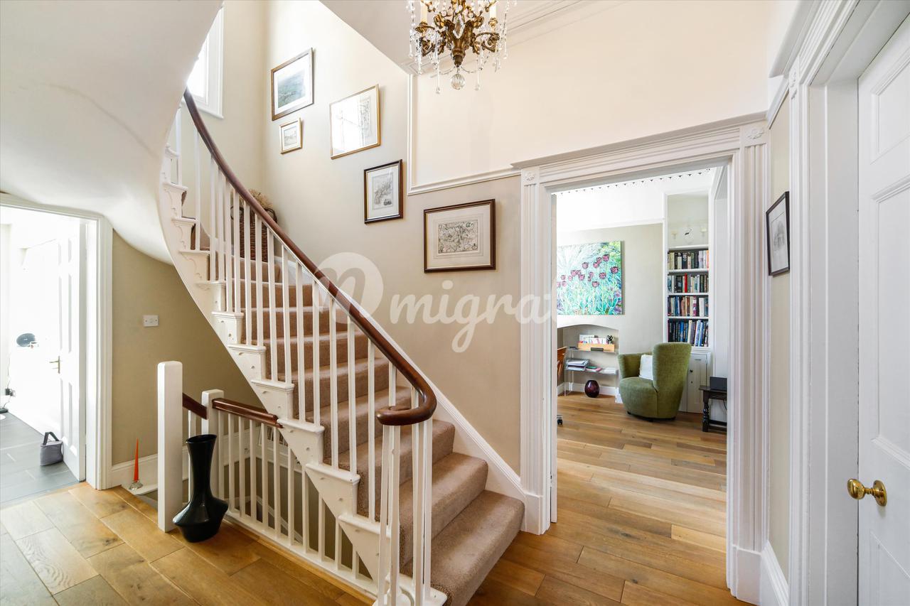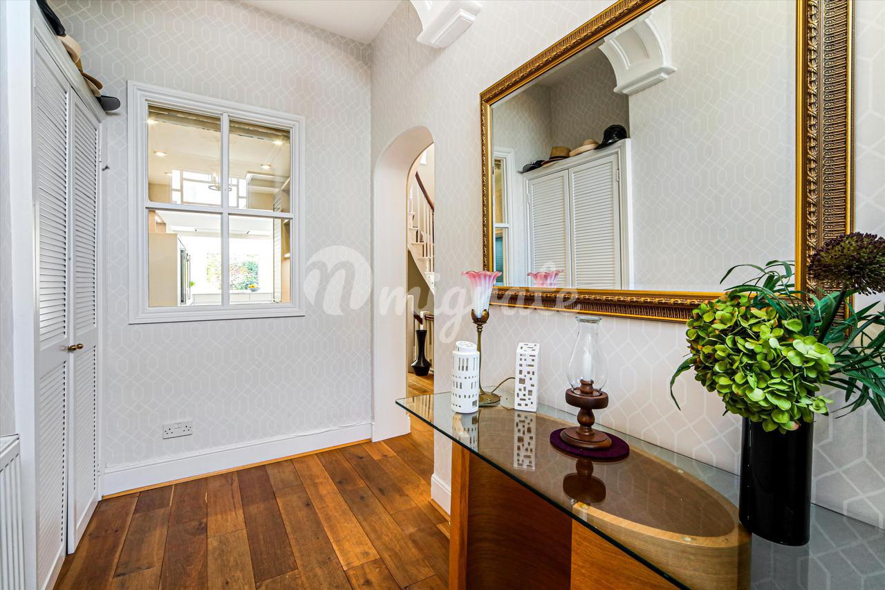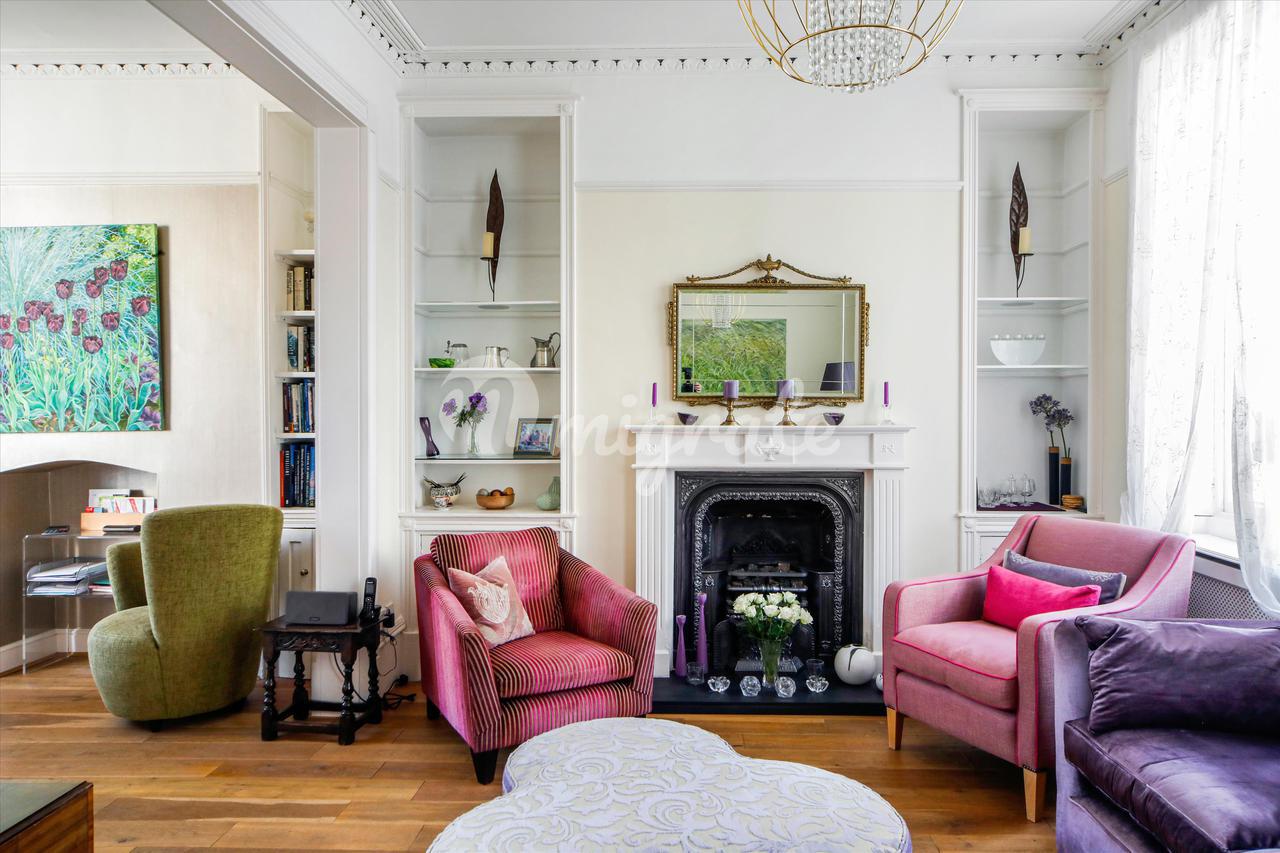 На первом этаже находится двойная гостиная со старинными каминами в передней части дома, а в центре дома находится кухня с современными шкафами без ручек, встроенной бытовой техникой Gaggenau и столешницами из материала Silstone. Кухня выходит прямо в впечатляющую столовую с полностью застекленной арочной крышей и двустворчатыми дверями, выходящими в сад. На цокольном этаже находится еще одна приемная, спальня с двуспальной кроватью, душевая и кухня-столовая. В дополнение к внутренней лестнице есть независимый доступ с передней части дома, что позволяет при необходимости использовать нижний этаж. На первом этаже есть три спальни, все со встроенными шкафами, одна с душевой комнатой и еще одна семейная ванная комната с ванной и отдельным душем.