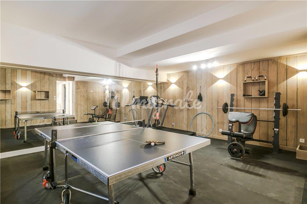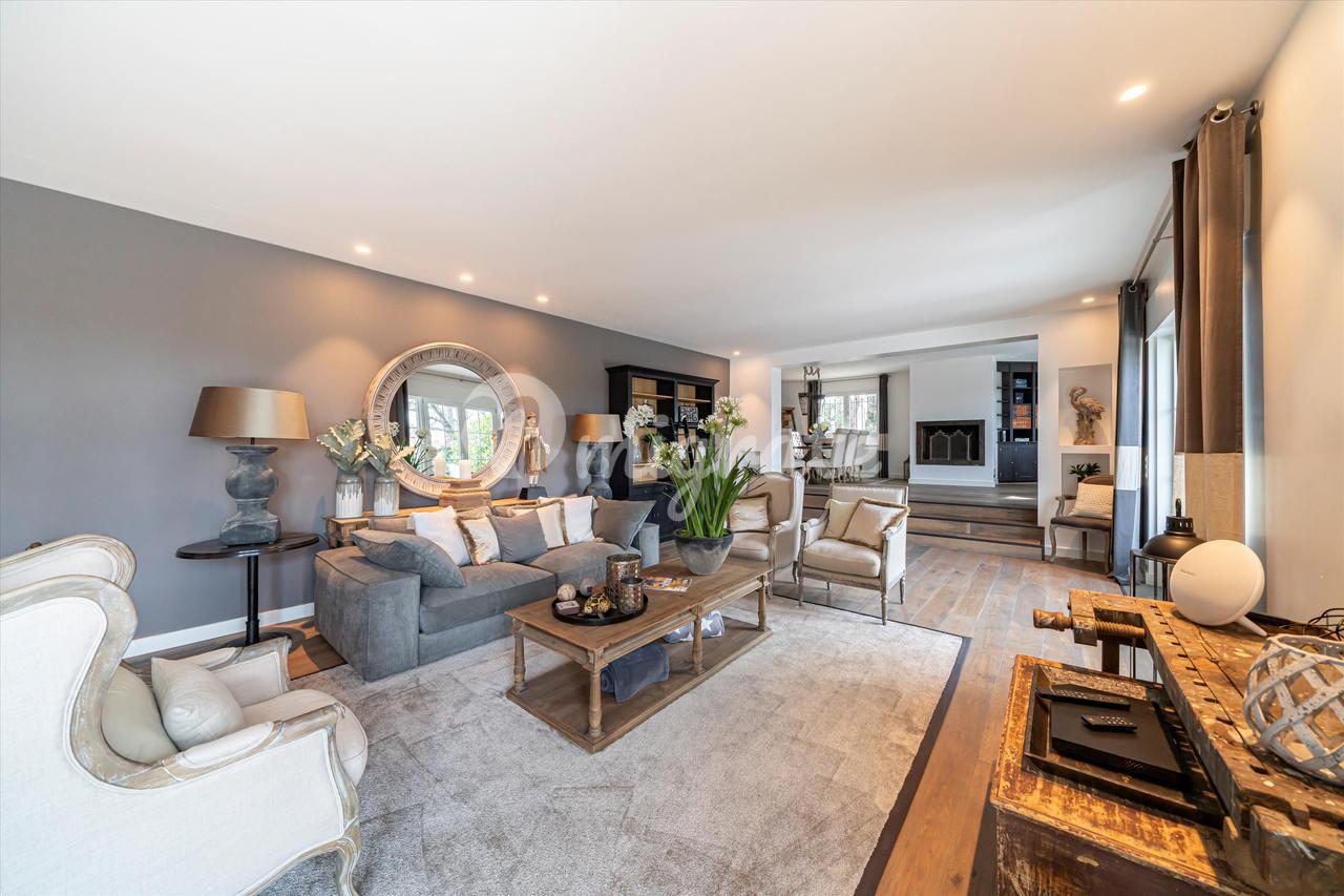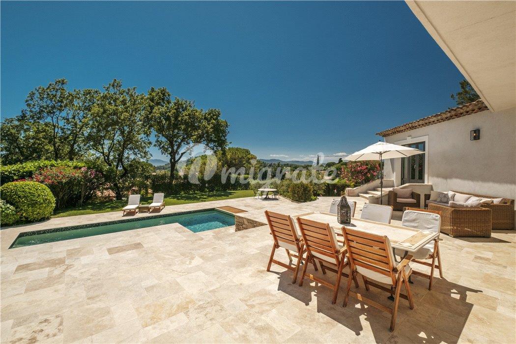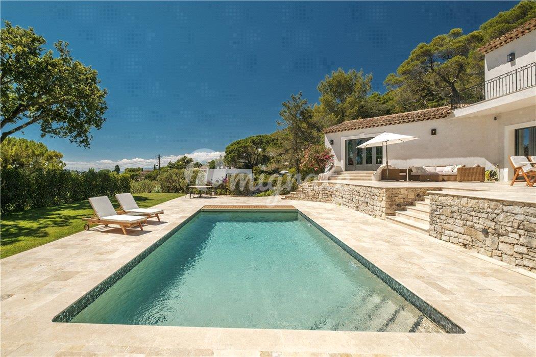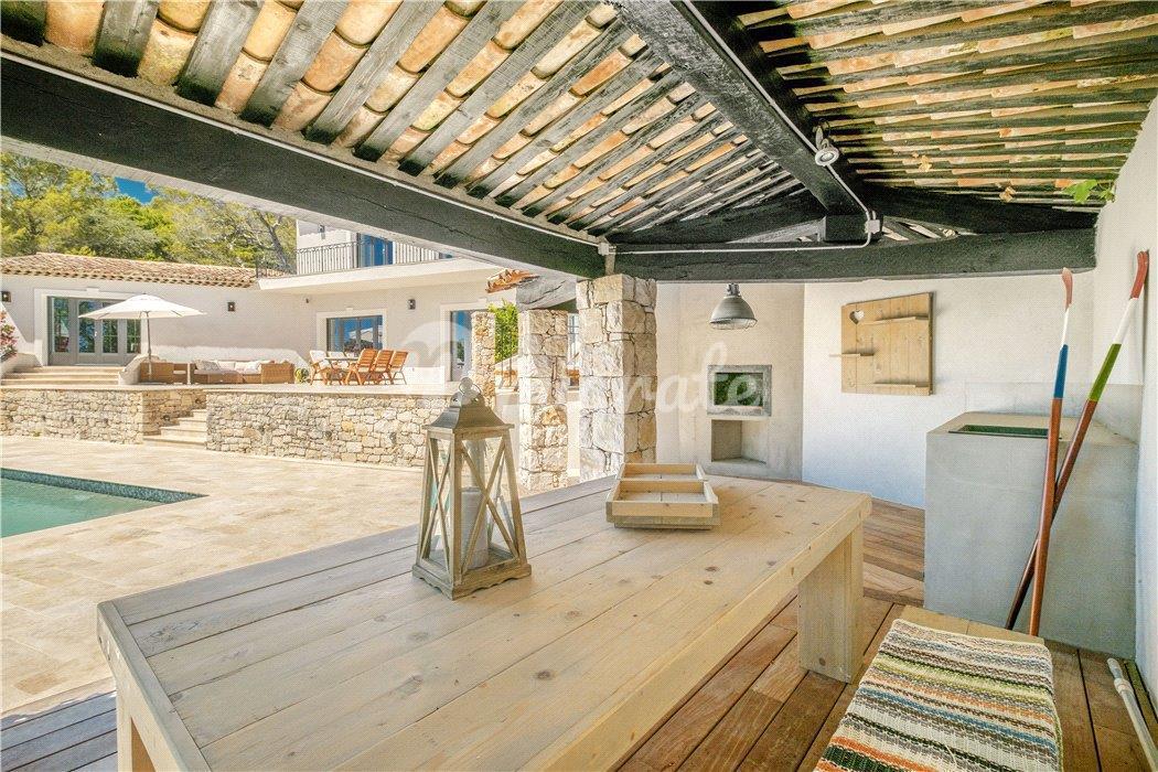 Сад с террасами, дом у бассейна с летней кухней и площадка для игры в петанк. Двойной гараж и открытая парковка еще на 8 автомобилей.
