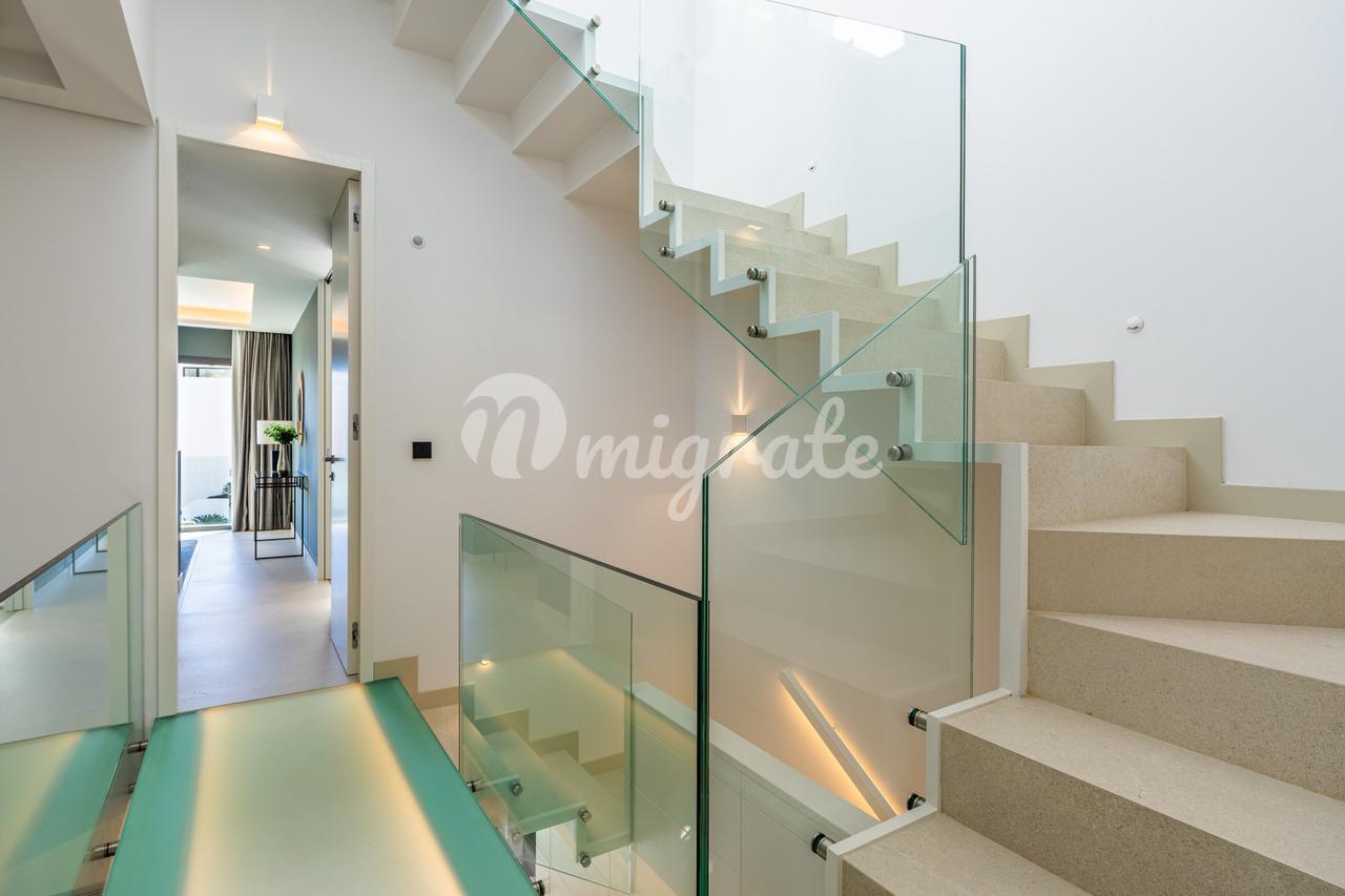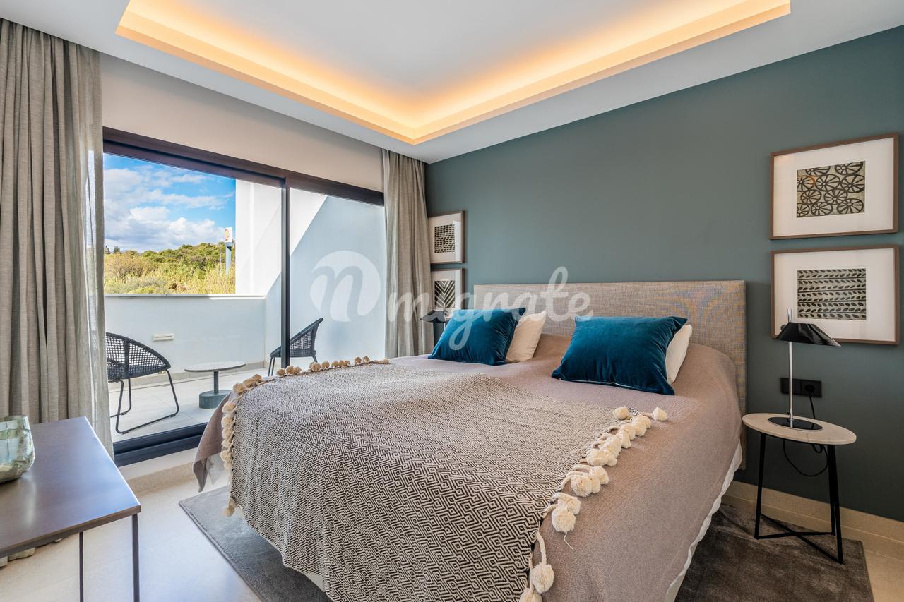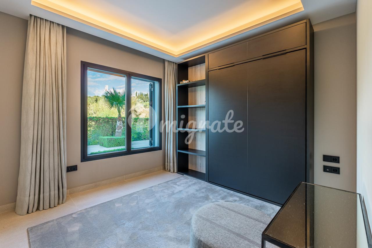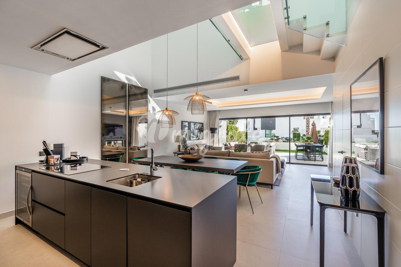 Он был спроектирован таким образом, чтобы максимально использовать естественное освещение, и имеет высокие потолки. Первый этаж включает в себя большое пространство, которое сочетает в себе гостиную, столовую и кухню с изысканным дизайном, большим центральным островом и первоклассной бытовой техникой, практичную спальню и полностью оборудованную ванную комнату. Гостиная выходит на прекрасную частично крытую веранду и частный сад с прекрасным видом на общественные сады, бассейн и море на заднем плане. Второй этаж состоит из двух спален с общей ванной комнатой и главной спальни с собственной ванной комнатой и прекрасной террасой с панорамным видом на Средиземное море и зоны общего пользования.