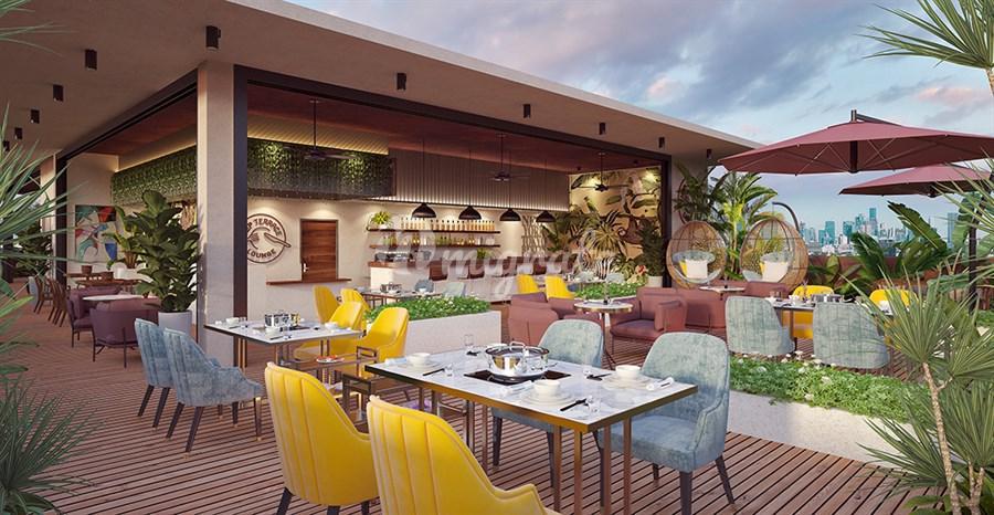 В жилом комплексе представлены апартаменты с 1-2 спальнями площадью 66-129 кв. м. Находящийся под круглосуточной охраной жилой комплекс предоставляет жильцам обширную инфраструктуру, включающую магазины, аптеки и кафе, а также просторную общую террасу на крыше с рестораном и фитнес-центром. Для удобства жителей на территории комплекса расположен 2-уровневый паркинг.