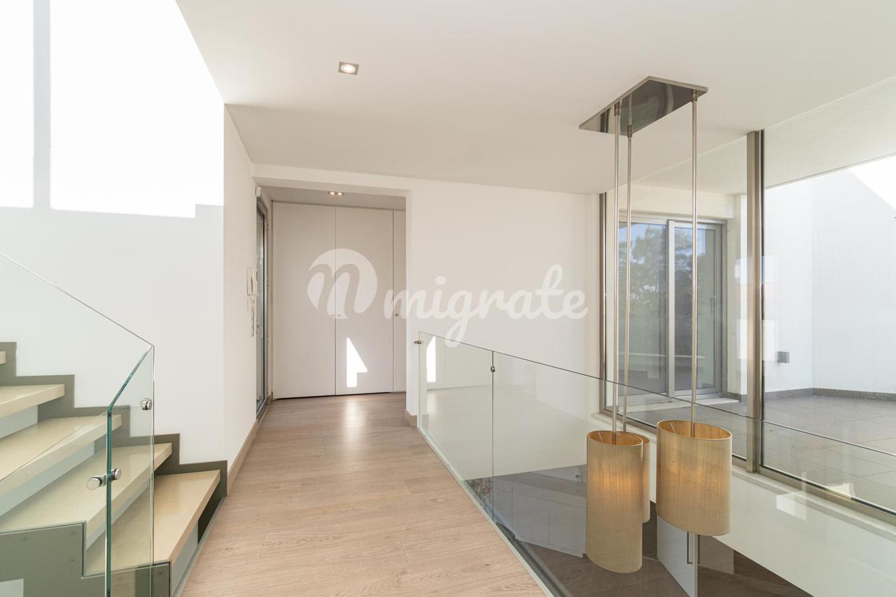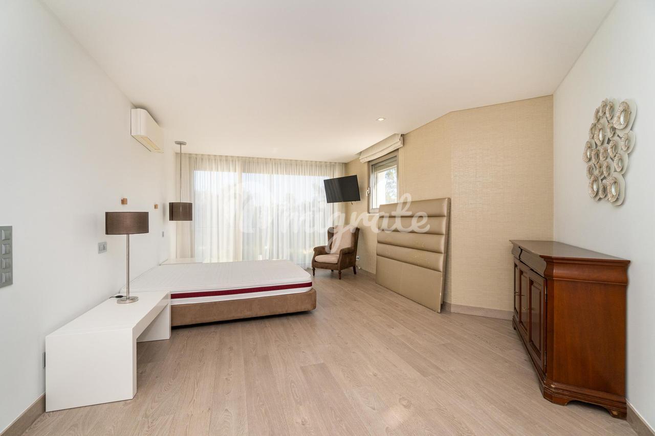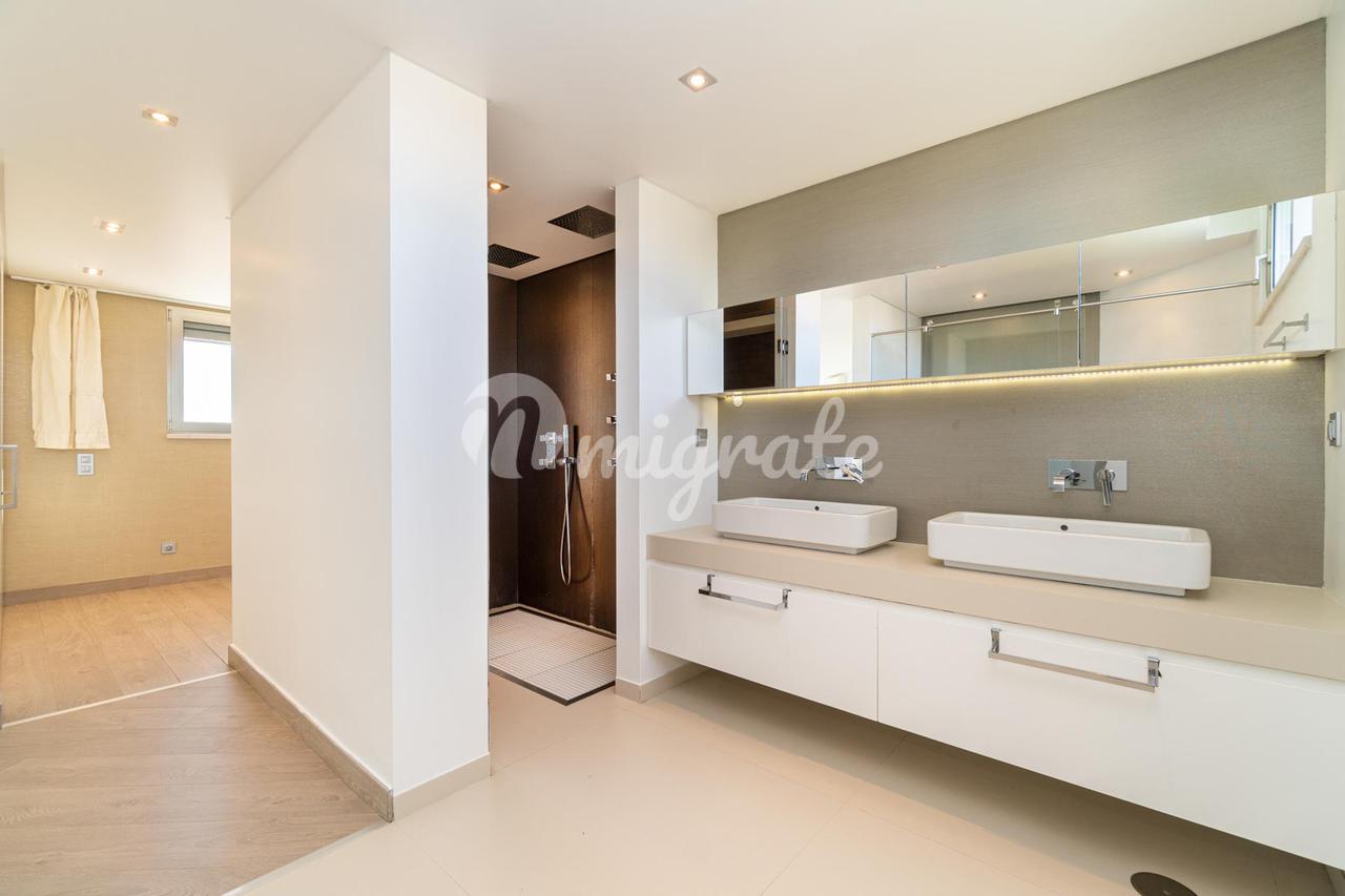 На первом этаже находится главная спальня с ванной комнатой и гардеробной, а также еще две спальни. На верхнем этаже есть просторная терраса с тренажерным залом и видом на реку Тежу.