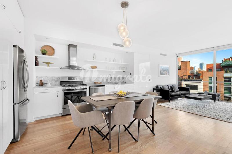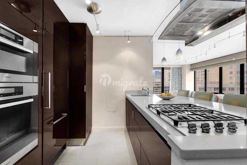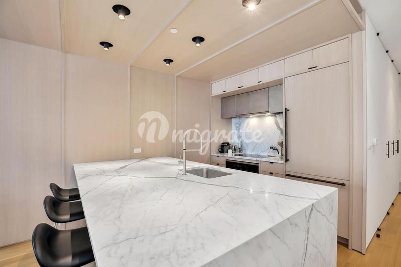 Безупречно скроенная кухня, спроектированная Workstead, сочетает изысканные детали с богатыми материалами. Индивидуальная кухня оснащена инкрустированными столешницами и фартуками из каменных плит Fior di Bosco, шкафами и столярными изделиями из кленового дерева в сочетании с фурнитурой из сатинированного никеля и первоклассной бытовой техникой Gaggenau. Изготовленный на заказ остров-полуостров ведет к гостиной и обеденной зоне, выходящей на юг, с большими окнами, которые увеличивают обилие жилого и развлекательного пространства.