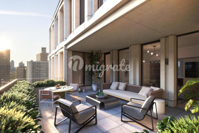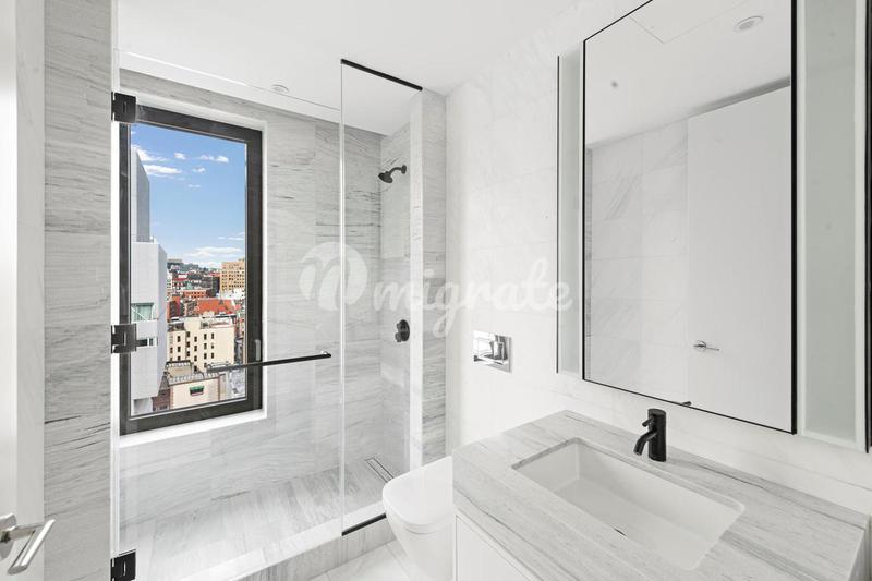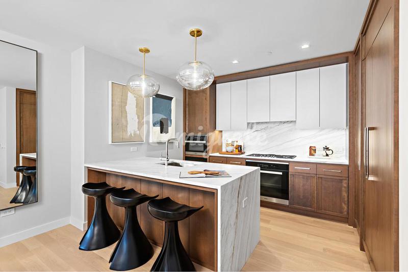 Расположенное в центре фойе переходит в большой зал, из которого открывается захватывающий вид на Манхэттенский мост. Доступные через двойные двери из большой комнаты и фойе, кухня и столовая стильно отделены от основной развлекательной зоны и представляют собой красиво обработанный остров с инкрустацией каменной плитой Fior di Bosco и скошенными краями, шкафы из клена с граблями в сочетании с фурнитурой из сатинированного никеля, и техника Gaggenau.