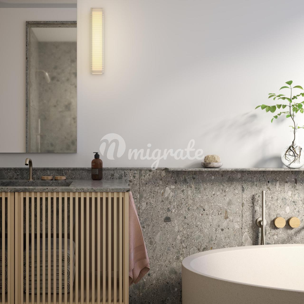 В первом люксе с видом на Манхэттенский мост есть большая гардеробная и ванная комната со стенами, полом и столешницей из отшлифованного камня Aglo Ceppo, элементами управления душем из полированного никеля, отдельно стоящей глубокой ванной и изготовленными на заказ решетчатыми полами. двойная раковина из белого клена с ручками из сатинированного никеля, установленными на палубе смесителями и элементами управления из дуба.