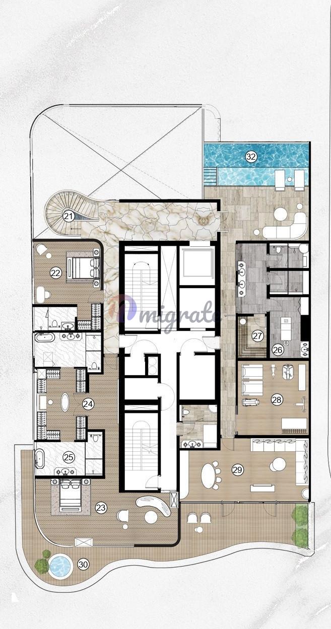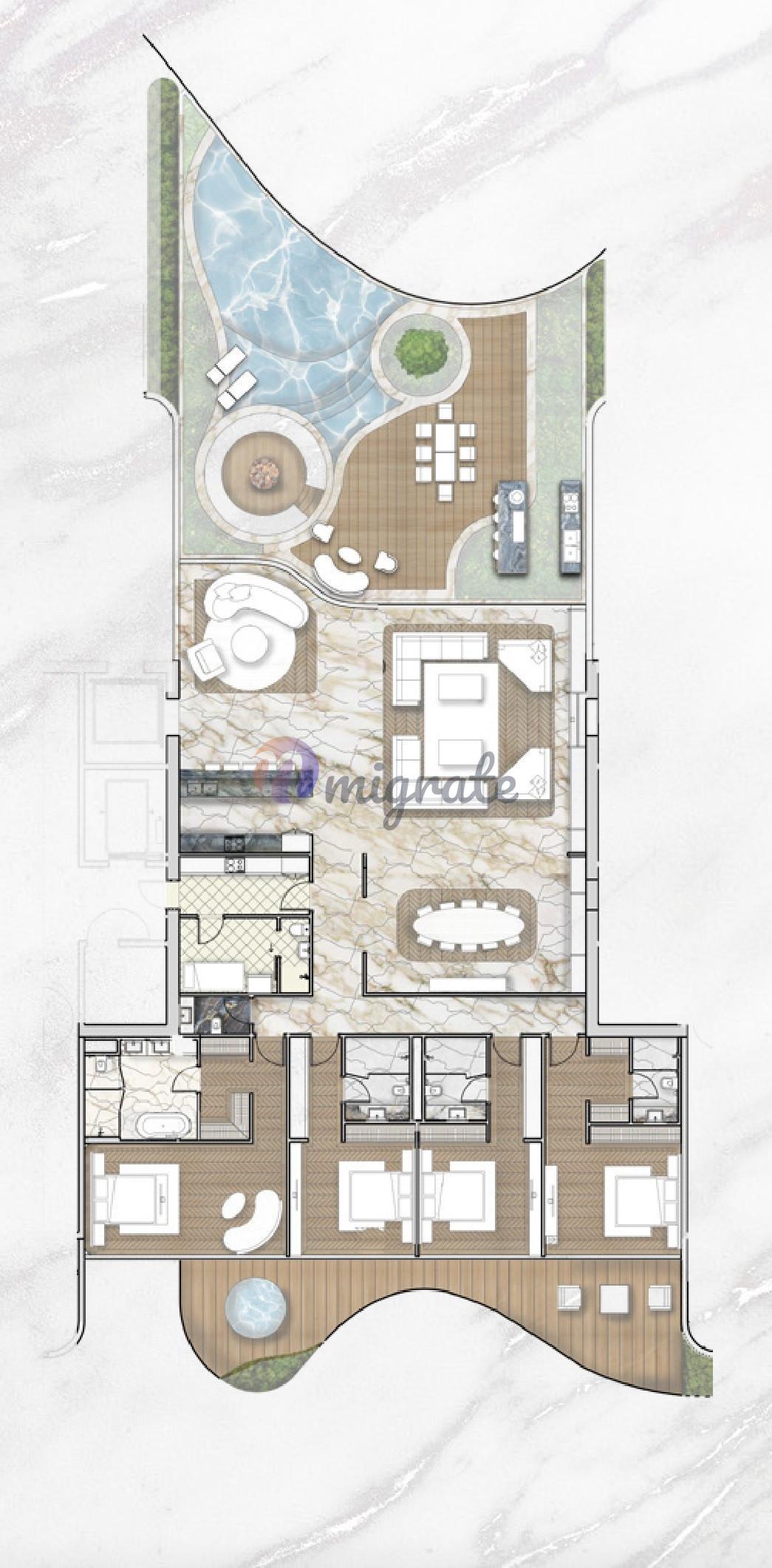 Спроектированный с учетом вида на океан, где каждый изгиб внешней архитектуры дополнен бассейнами и зелеными насаждениями, придающими застройке волнообразный характер. Кроме того, в некоторых квартирах есть террасы с частным бассейном и развлекательными зонами как для жителей, так и для гостей.