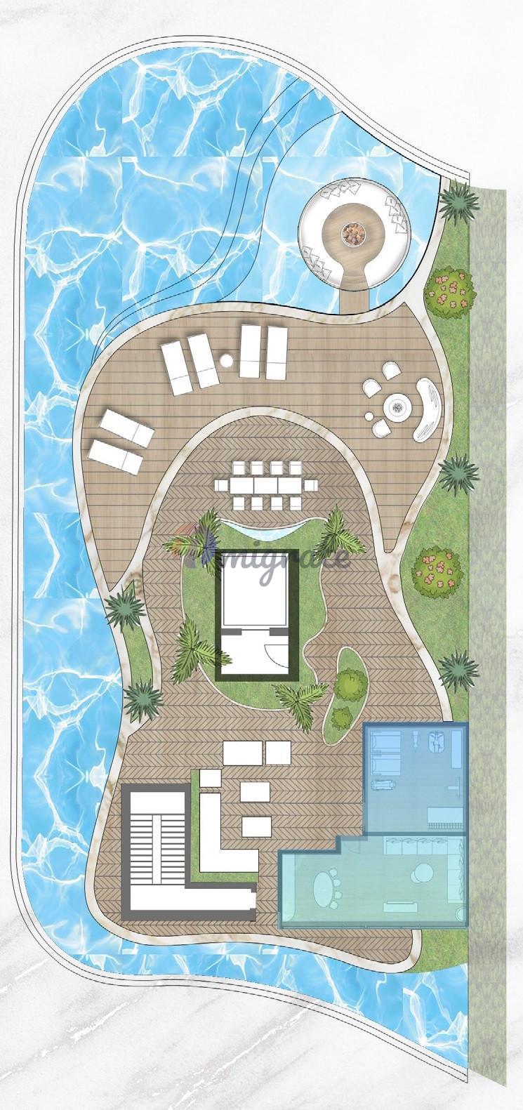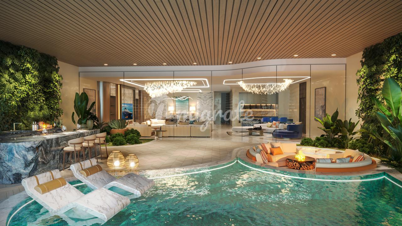 В планировке sky villa: просторная гостиная, столовая, открытая кухня, прачечная комната, хозяйская спальня и гостиная, 4 гостевых комнаты, офис, две комнаты персонала, прачечная и кладовая, открытая терасса, частный бассейн, обеденная зона и зона отдыха на открытом воздухе.