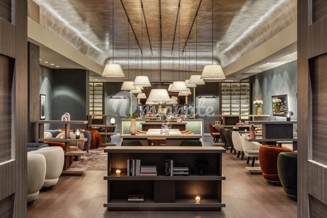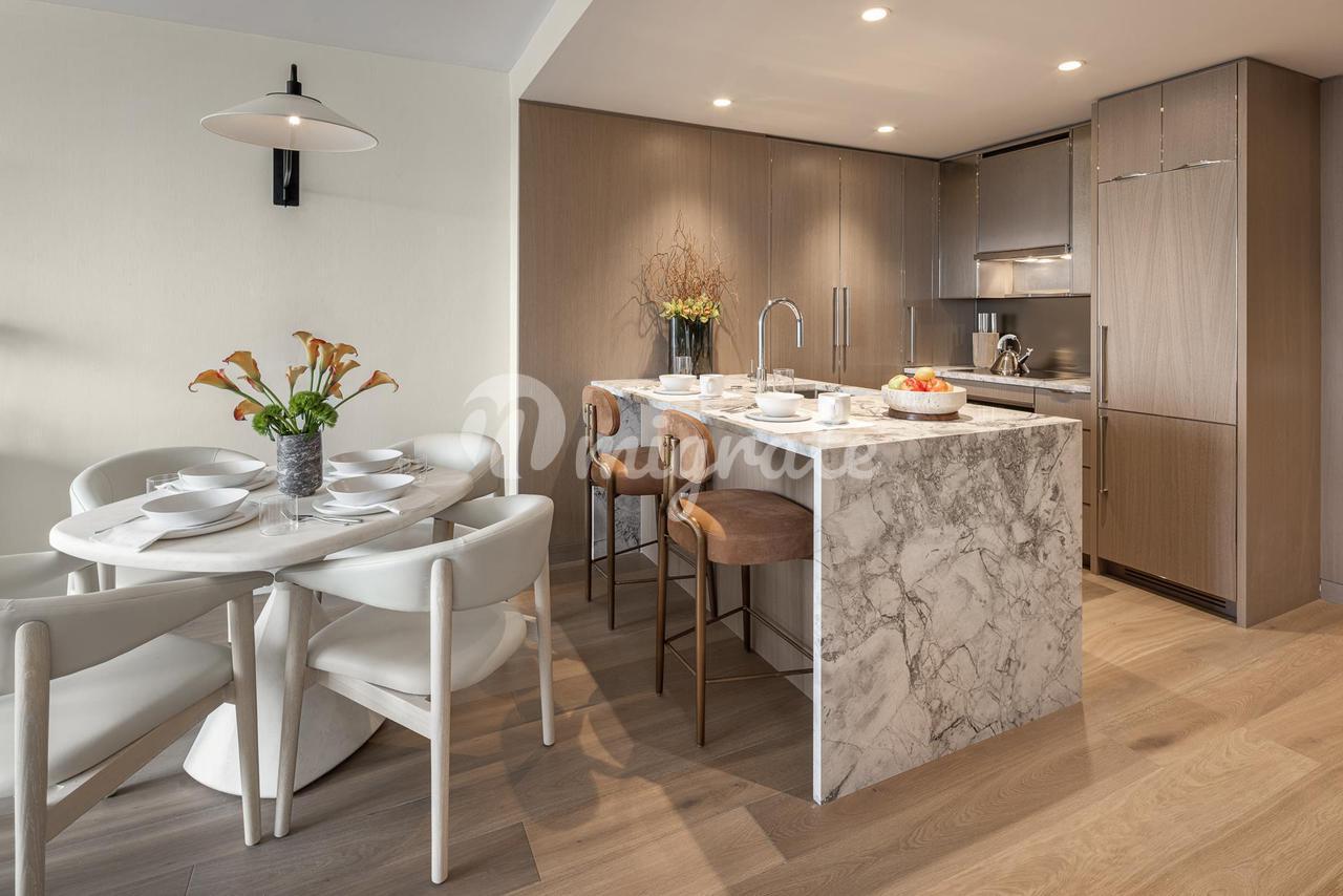 Входя через входную дверь из европейского дуба, вы попадаете на прекрасно оборудованную кухню со столешницей и островом из супер-белого кварцита, задней панелью из бронзы и тонированного зеркального стекла, корпусной мебелью из белого дуба с матовым лаком и рифленым зеркальным стеклом, а также стенами, обшитыми панелями из белого дуба. Элегантный набор бытовой техники Miele включает холодильник с морозильной камерой, индукционную варочную панель с полностью вентилируемой вытяжкой, настенные и скоростные духовые шкафы, а также посудомоечную машину. Винный холодильник marvel стильно дополняет комплектацию бытовой техники Miele. Встроенная раковина Kraus оснащена хромированным краном, изготовленным на заказ. Кухня ведет в просторную гостиную с изысканными деталями от Thomas Juul-Hansen и 7-дюймовым полом из европейского дуба.