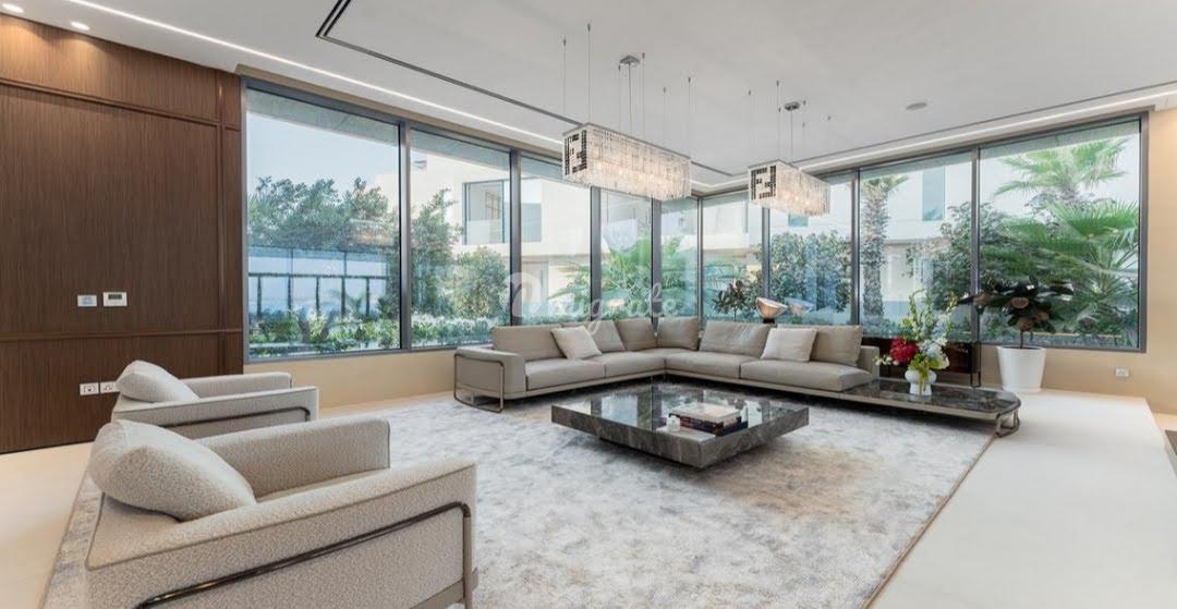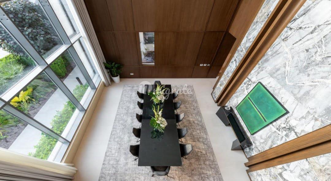 Дом построен по индивидуальному проекту известной командой архитекторов и дизайнеров, чтобы создать идеальное сочетание стиля и комфорта. В доме установлены стеклянные стены во всю высоту, что позволяет естественному свету проникать сквозь них и подчеркивать невероятный вид. Высота всех потолков, от входного фойе до основных жилых зон, составляет впечатляющие 13 метров. Здесь есть несколько официальных и неофициальных гостиных, элегантная столовая и современная кухня шеф-повара с техникой Miele, изготовленными на заказ шкафами, обширным островом и примыкающей к нему кухней для приготовления пищи.