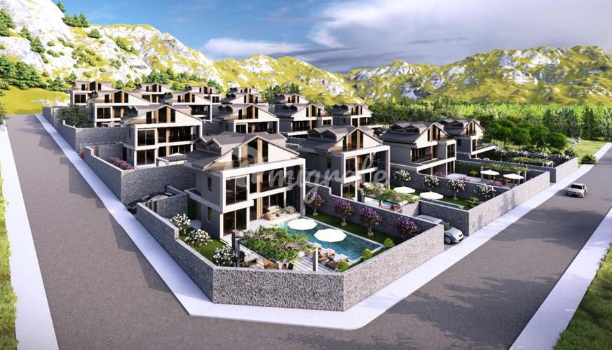 Виллы находятся в Овачике в Фетхие. Характеристики: 3 спальни, 1 гостиная и кухня, 3 ванные комнаты, пол с подогревом, полностью меблированные, красивый вид на горы и природу, частный крытый бассейн с