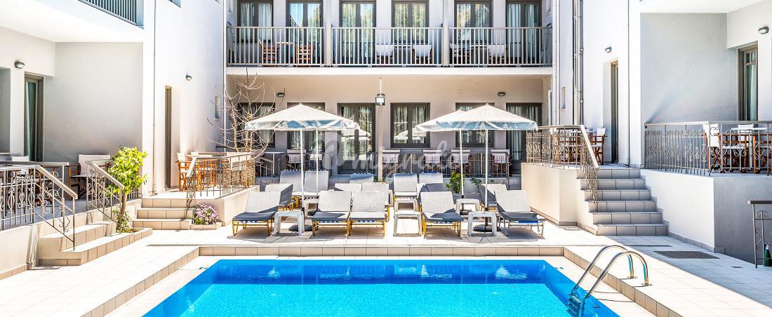 Отель расположен на побережье в сердце туристической зоны города Ханья, на северо-западе острова Крит. Площадь земельного участка составляет 1350 кв. м. Общая площадь гостиницы - 928,51 кв. м (плюс цокольный этаж и патио). Состоит из 22 номеров и 61 спальных мест. На территории есть большой бассейн, солнечная терраса, бар, ресепшн и тренажерный зал. Вспомогательные помещения расположены на цокольном этаже. Окна гостиницы имеют вид на сад и на море. В 250 метрах гостиницы находятся несколько оборудованных песчаных пляжей.