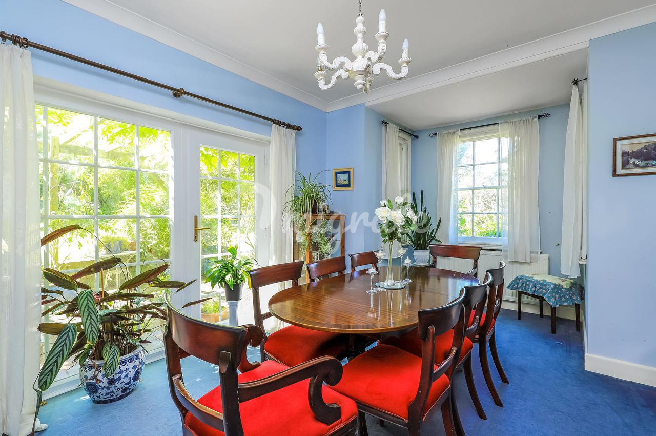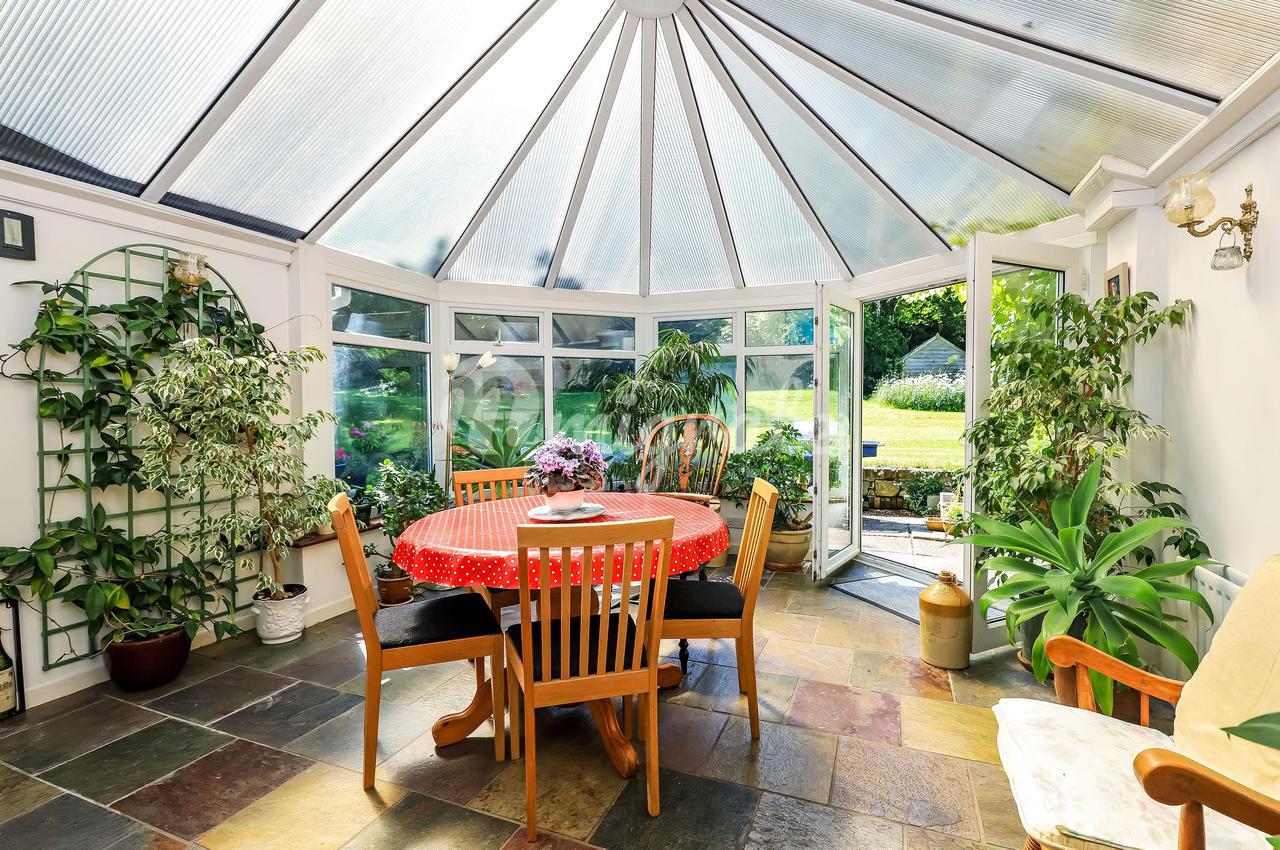 В стороне от дороги тропинка ведет к вестибюлю и коридору с дверями в большинство комнат первого этажа. Существует двойная гостиная с дровяной печью и эркером с видом на палисадник. Двойные двери ведут в столовую, из которой есть выход на выходящую на юг террасу с беседкой, увитой виноградной лозой. Кухня оборудована масляной печью Aga и ведет прямо в зал для завтраков/зимний сад, выходящий на южную сторону. Остальную часть первого этажа составляют гостиная, подсобное помещение, душевая, кладовая и ступеньки в подвал. Наверху в основной спальне есть стена со встроенными шкафами и потрясающий вид на окрестности. Есть еще четыре спальни и две ванные комнаты (одна из них примыкает к спальне).