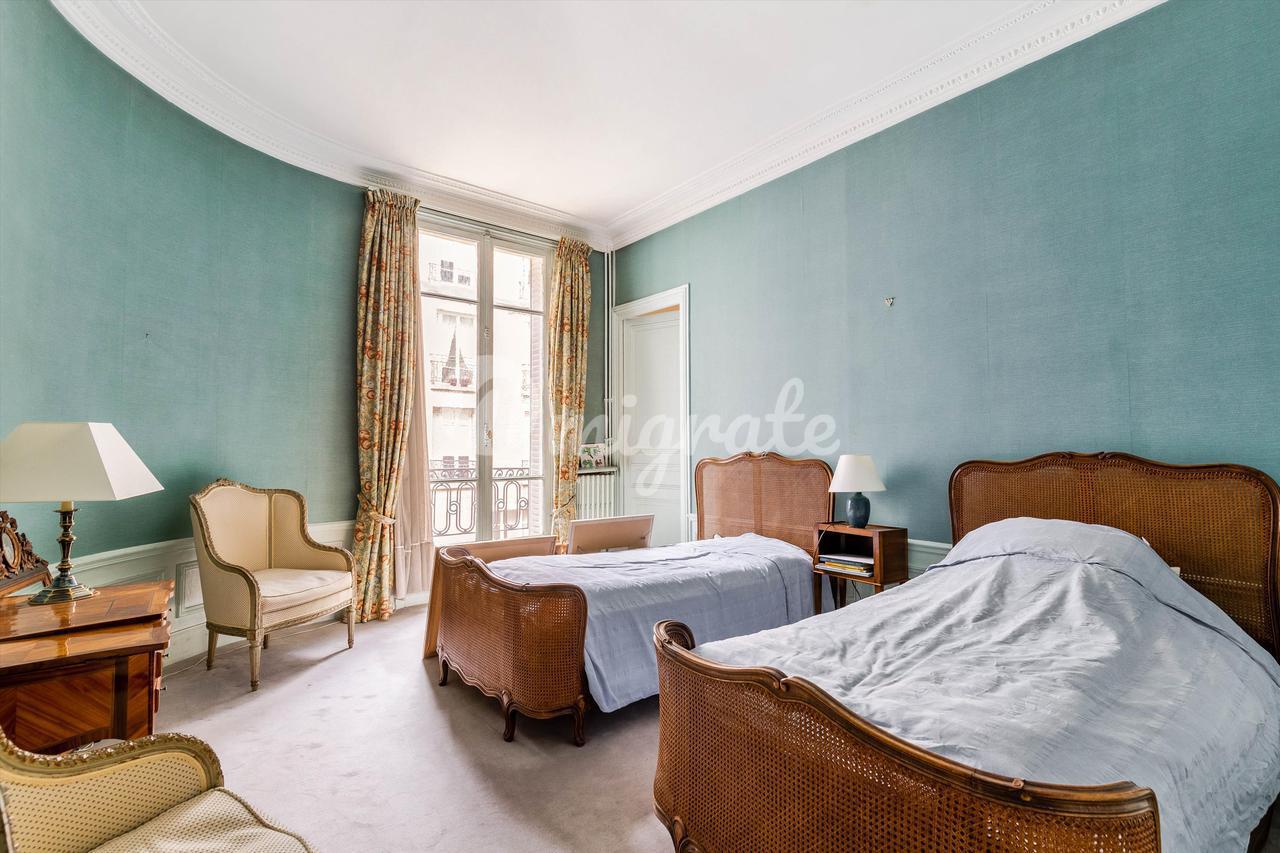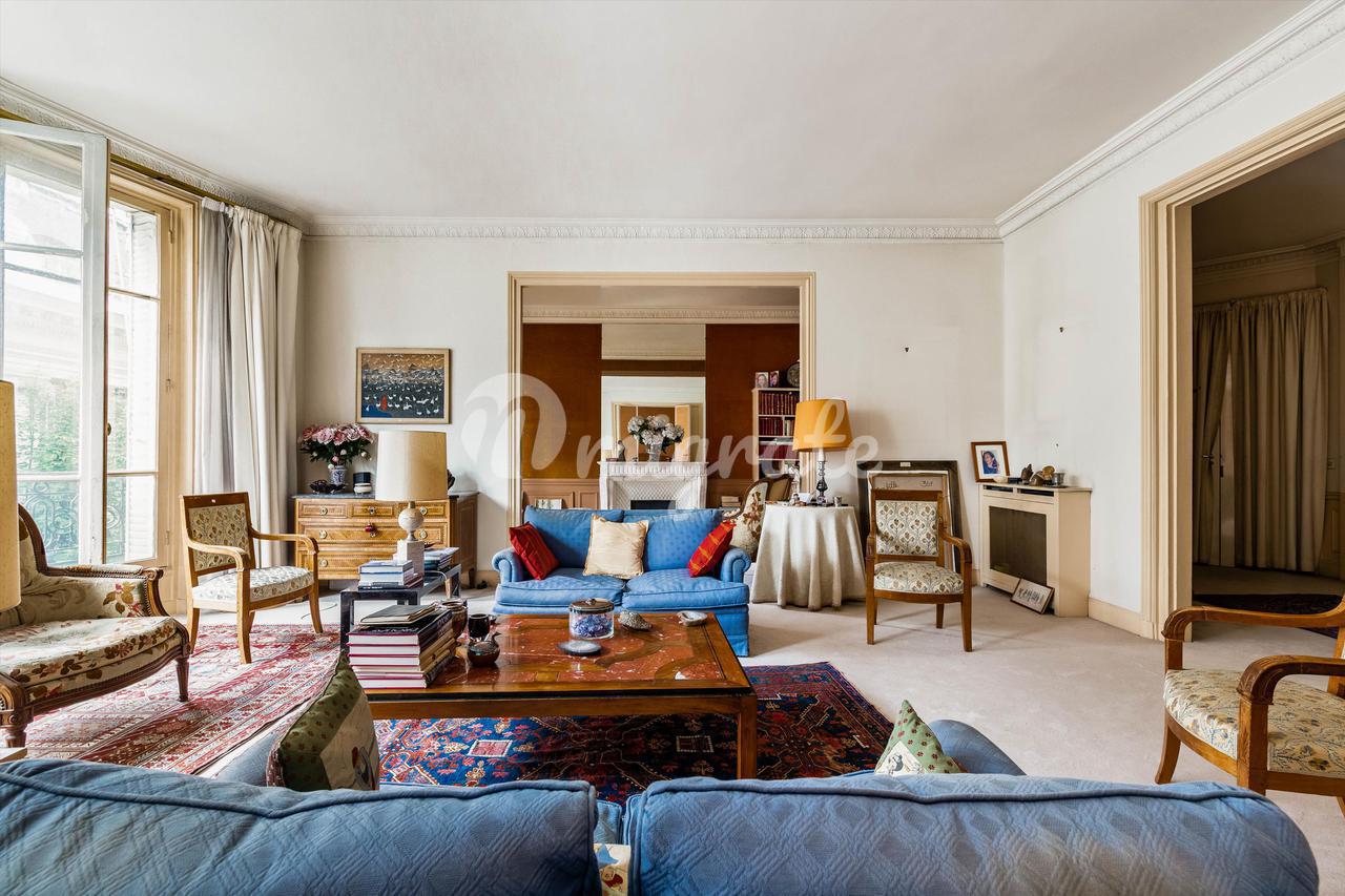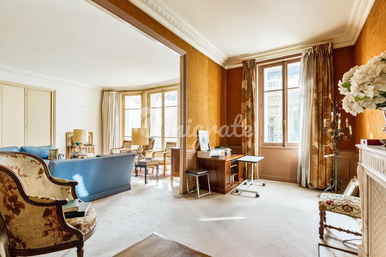 На тихой улице, расположенной на третьем этаже превосходного старого каменного здания, оборудованного лифтом, великолепная семейная квартира площадью 233,58 кв.м. Carrez law. Это исключительное свойство выгодно отличается идеальной планировкой, которая предлагает двойную гостиную с видом на юг, столовую, большую отдельную кухню, четыре спальни, включая люкс с ванной комнатой и туалетом, а также еще одна ванная комната с туалетами и гостевыми туалетами. На седьмом этаже расположены три подсобных помещения площадью 6,90 кв.м, 10,84 кв.м и 6,16 кв.м Carrez law, куда можно подняться на лифте, а также большой подвал дополняют это свойство. Охраняемое здание с постоянным смотрителем