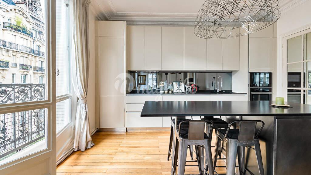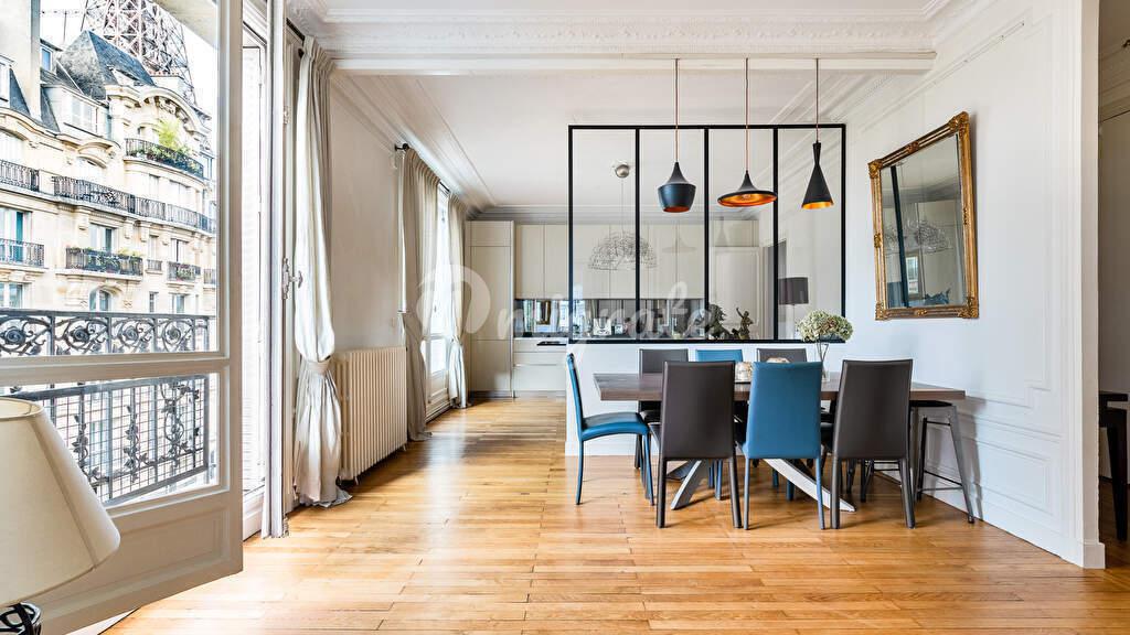 В тихом переулке на Марсовом поле с великолепным видом на Эйфелеву башню эта семейная квартира Carrez площадью 132,02 кв. м. была полностью отремонтирована четыре года назад. Расположенный на четвертом этаже с лифтом в очень ухоженном османовском здании с смотрителем, он сохранил всю печать своего времени. Тихая и светлая, имеет прихожую, угловую гостиную с камином, примыкающую столовую, полуоткрытую столовую кухню Linea Quatro, две спальни с видом на улицу, спальню с видом во двор, ванную комнату с прачечной. и туалеты, душевая с туалетами, отдельные туалеты и шкафы. Большой подвал площадью 10 м2 и помещение для хранения велосипедов дополняют это предложение. Из всех номеров, выходящих на улицу, открывается прекрасный вид на Эйфелеву башню.